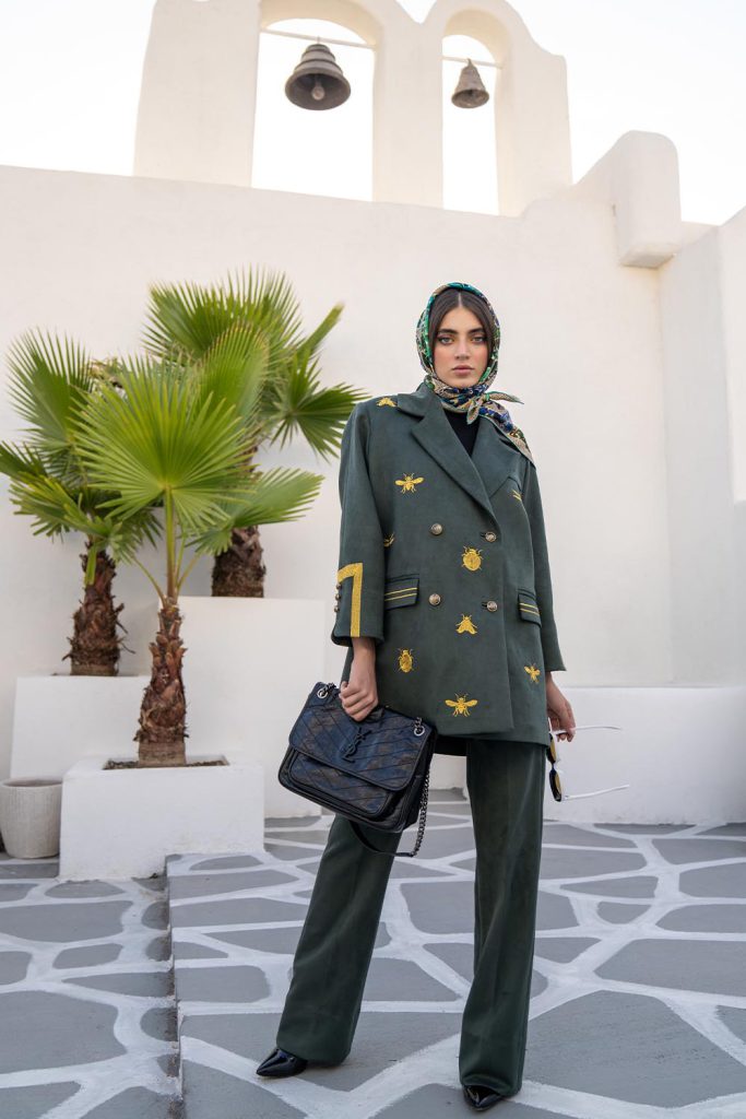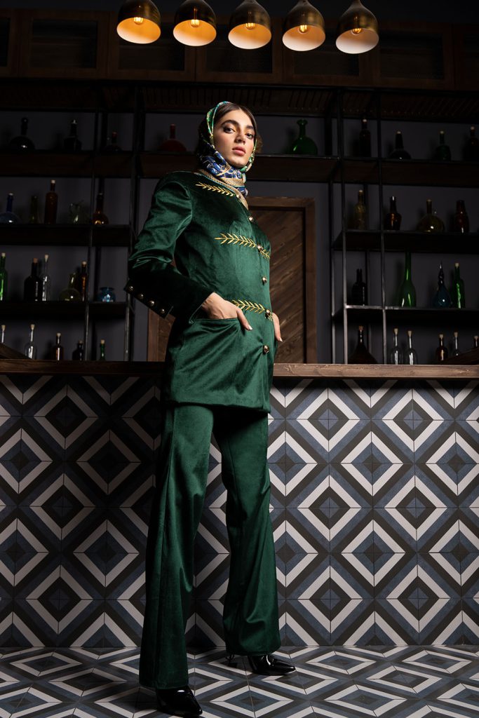 Black and white chequered closed colour jacket with blue and grey flying bird embroidery and blue fine piping on edges
