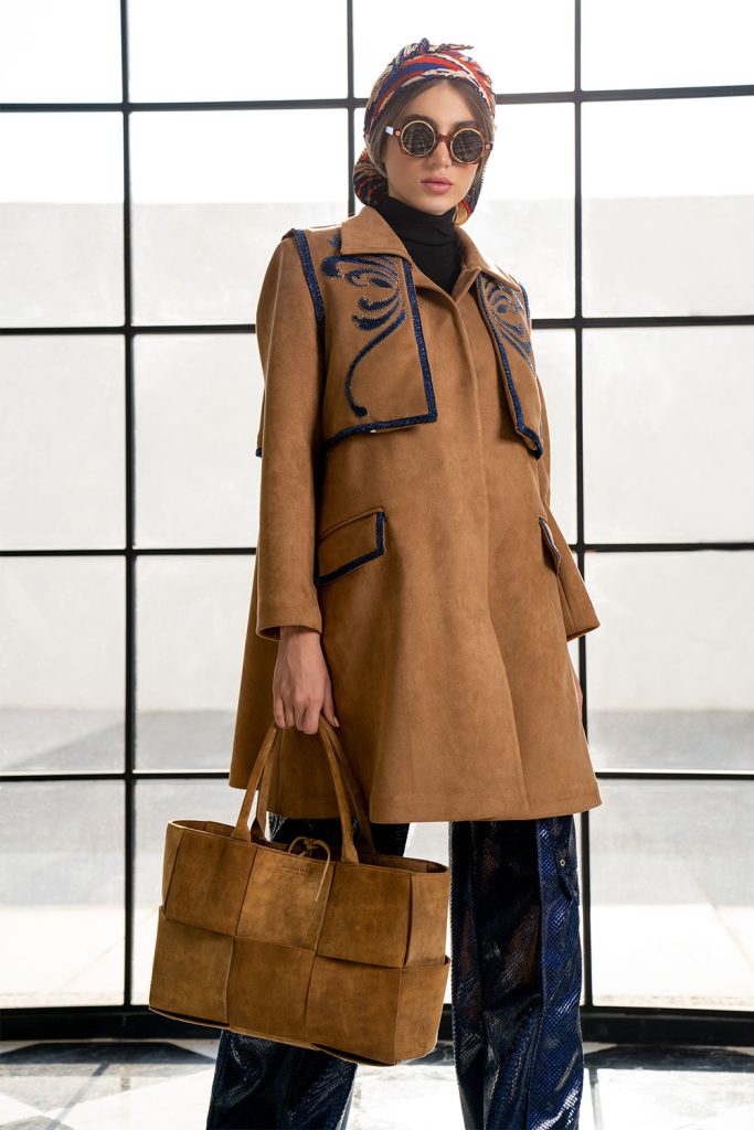 Brown tan faux swede midi coat- with navy python embossed detail on pockets and sewn patterns on upper