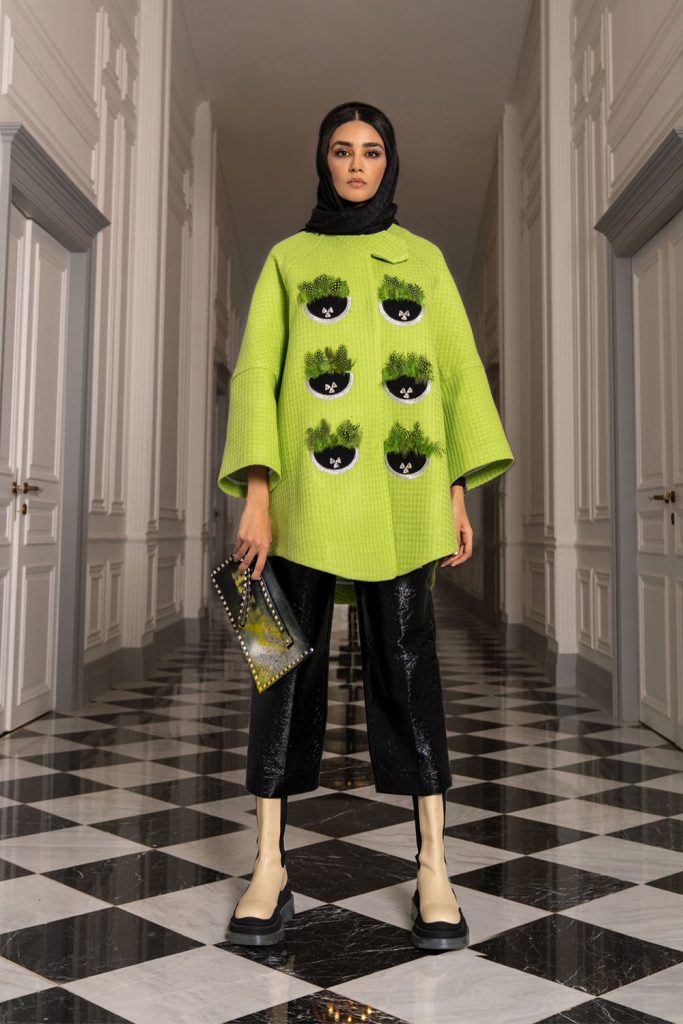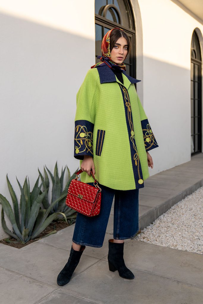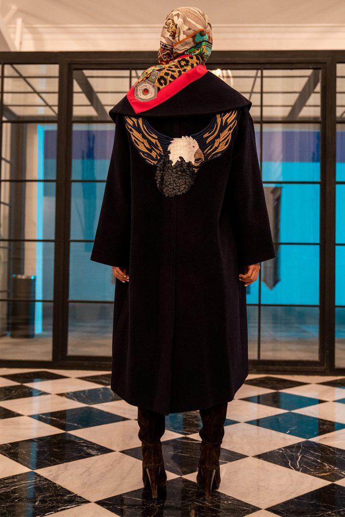 Black long woollen coat with wide collar – large spread winged eagle embroidered in black/brown/white on back