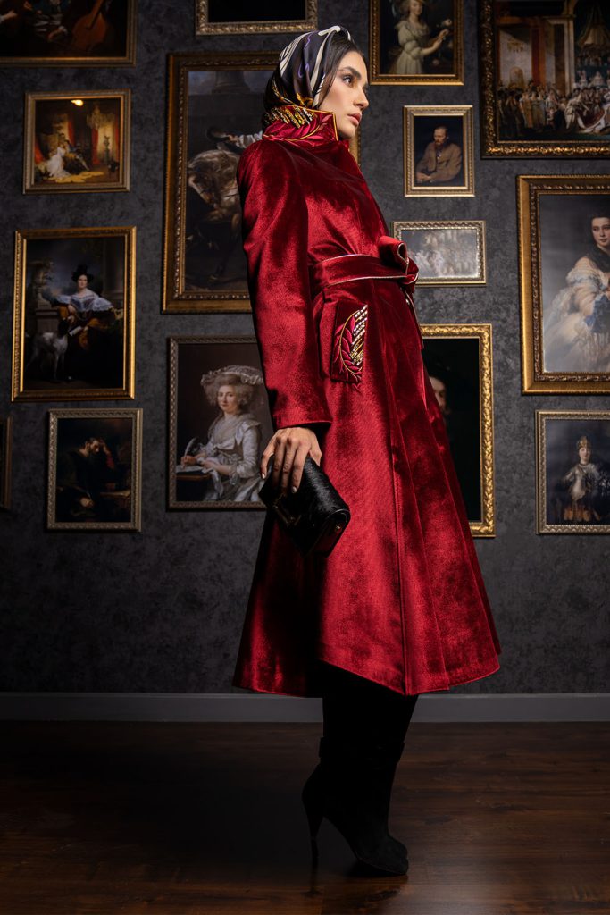 Royal red shiny velvet coat with belt – embroidery of leaves on cuffs and collar in gold and red satin