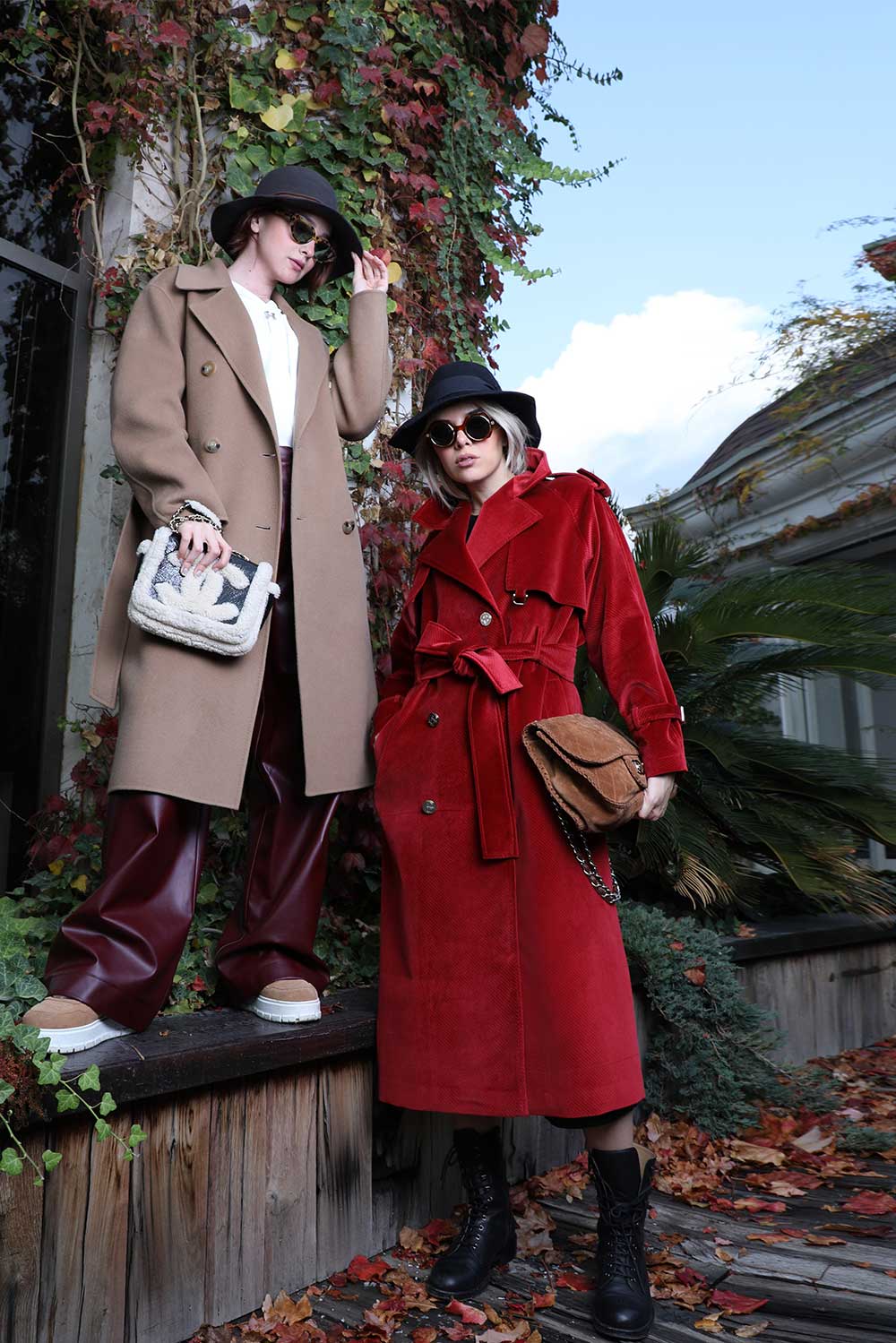 A stunning long manteau in sumptuous Italian red velvet, featuring a cinched waist belt