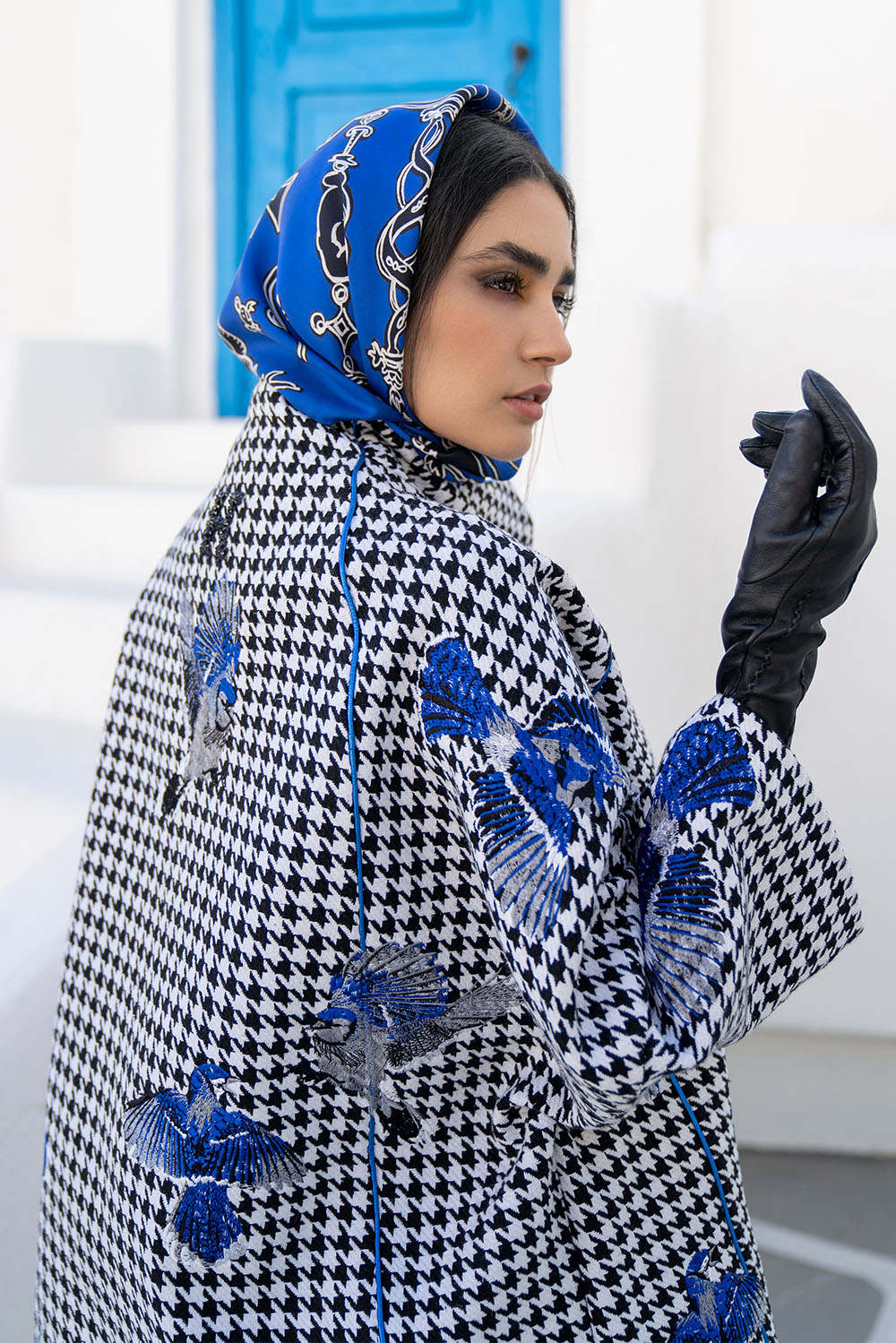 Home2021October Black and white chequered closed colour jacket with blue and grey flying bird embroidery and blue fine piping on edges