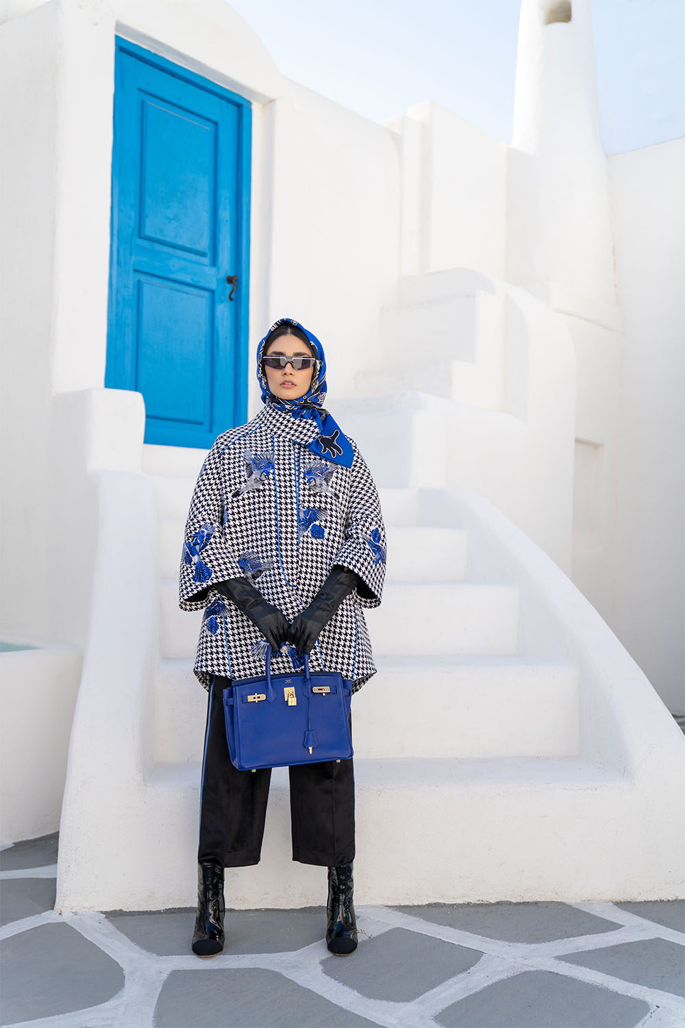 Black and white chequered closed colour jacket with blue and grey flying bird embroidery and blue fine piping on edges
