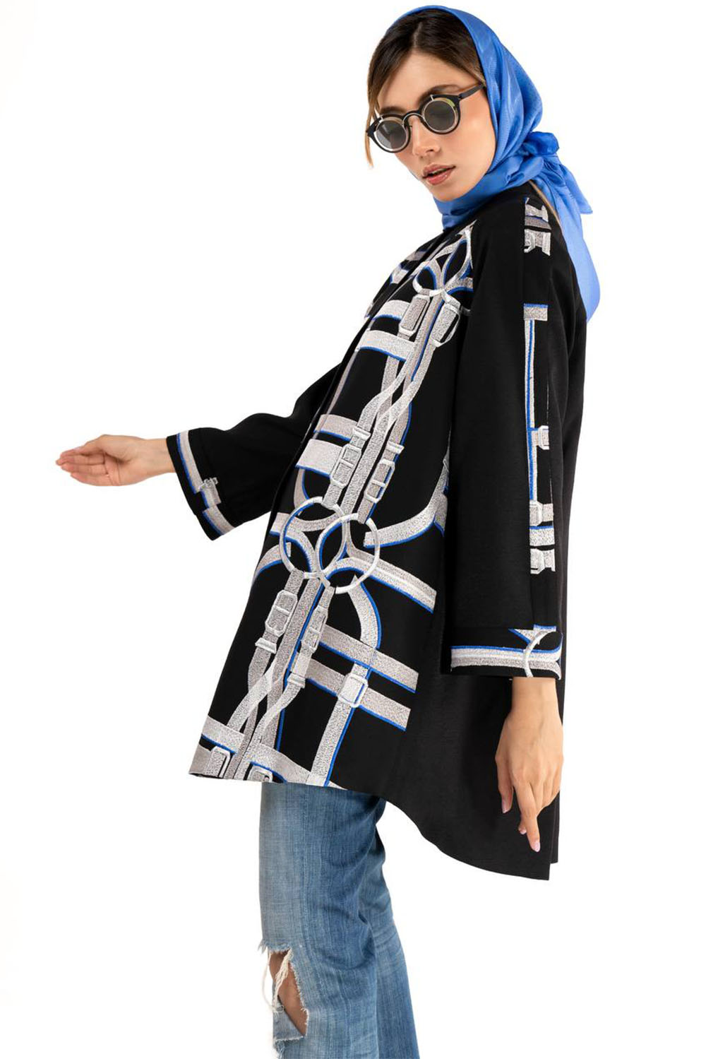 Knee length white coat with chains and straddle embroidery in light blue/orange and grey on back and around cuffs