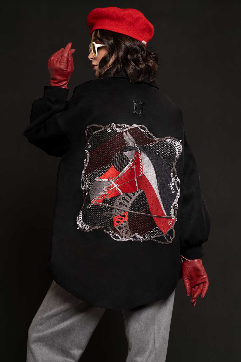 Be the first to review “Black cashmere midi coat with a frame embroidered equine head on back in red and grey” Cancel reply