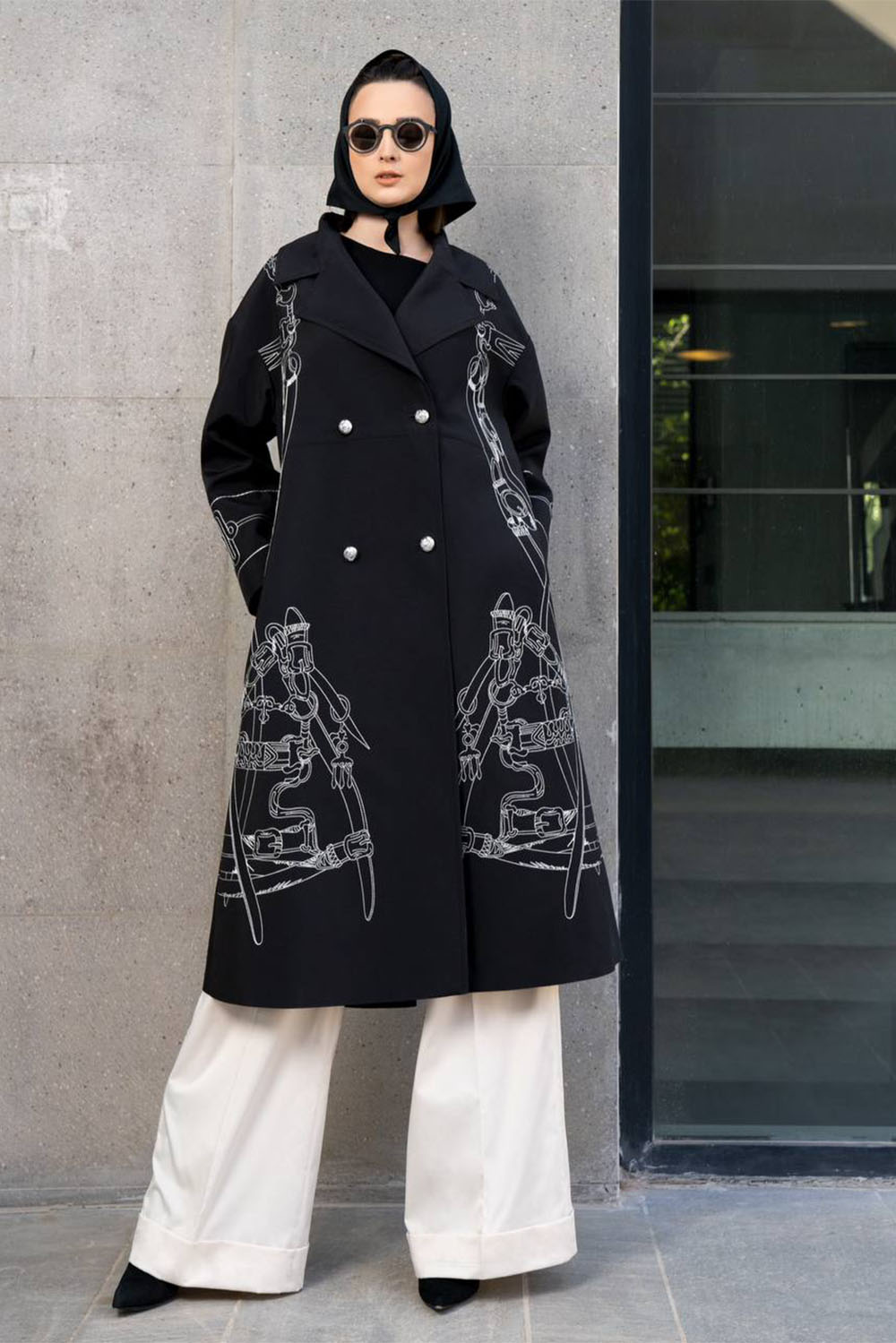 Black knee length jacket with belts and chains embroidery all over back and detail on cuffs