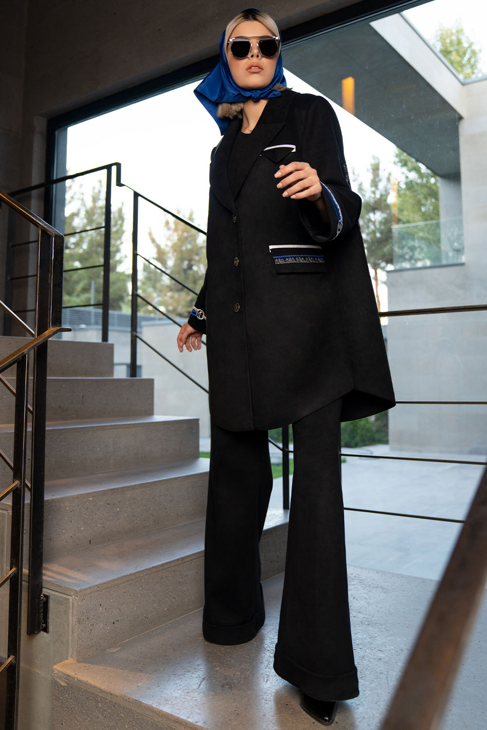 Black midlength jacket with suede detail on edges - dragonfly alphabet crown embroidered all over in blues and silver