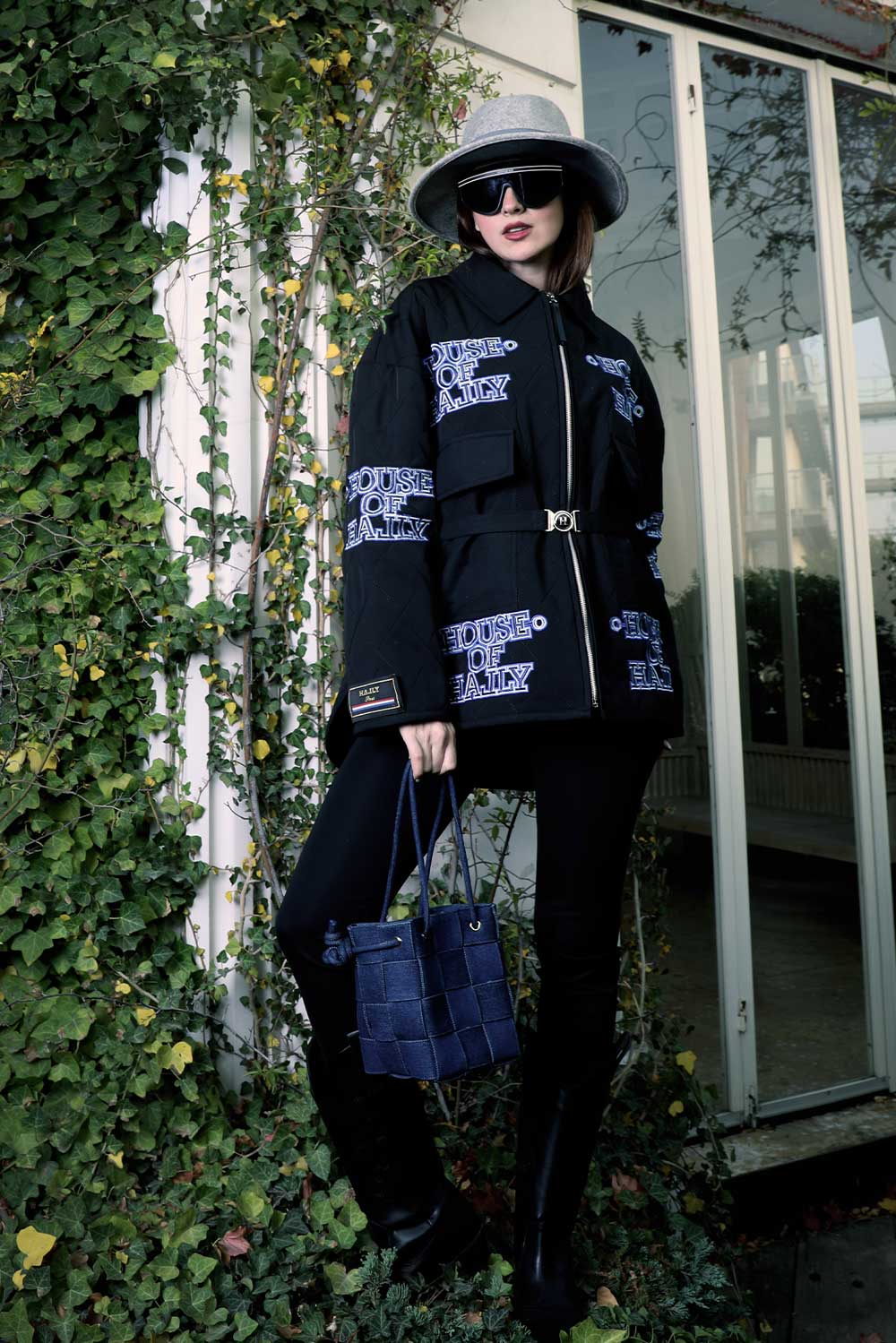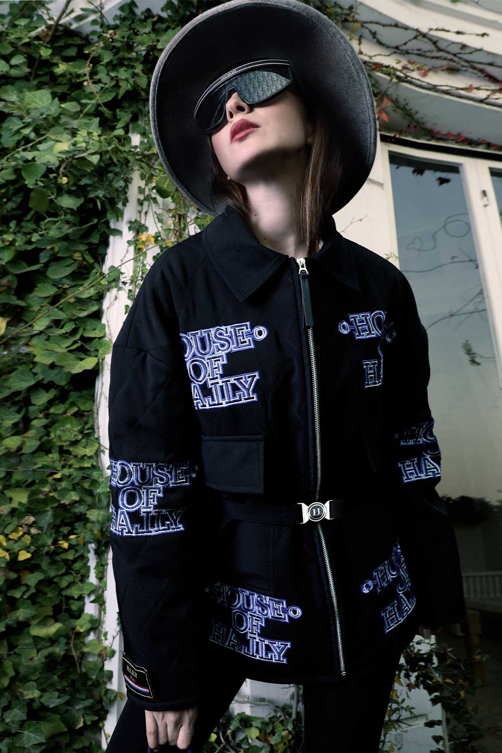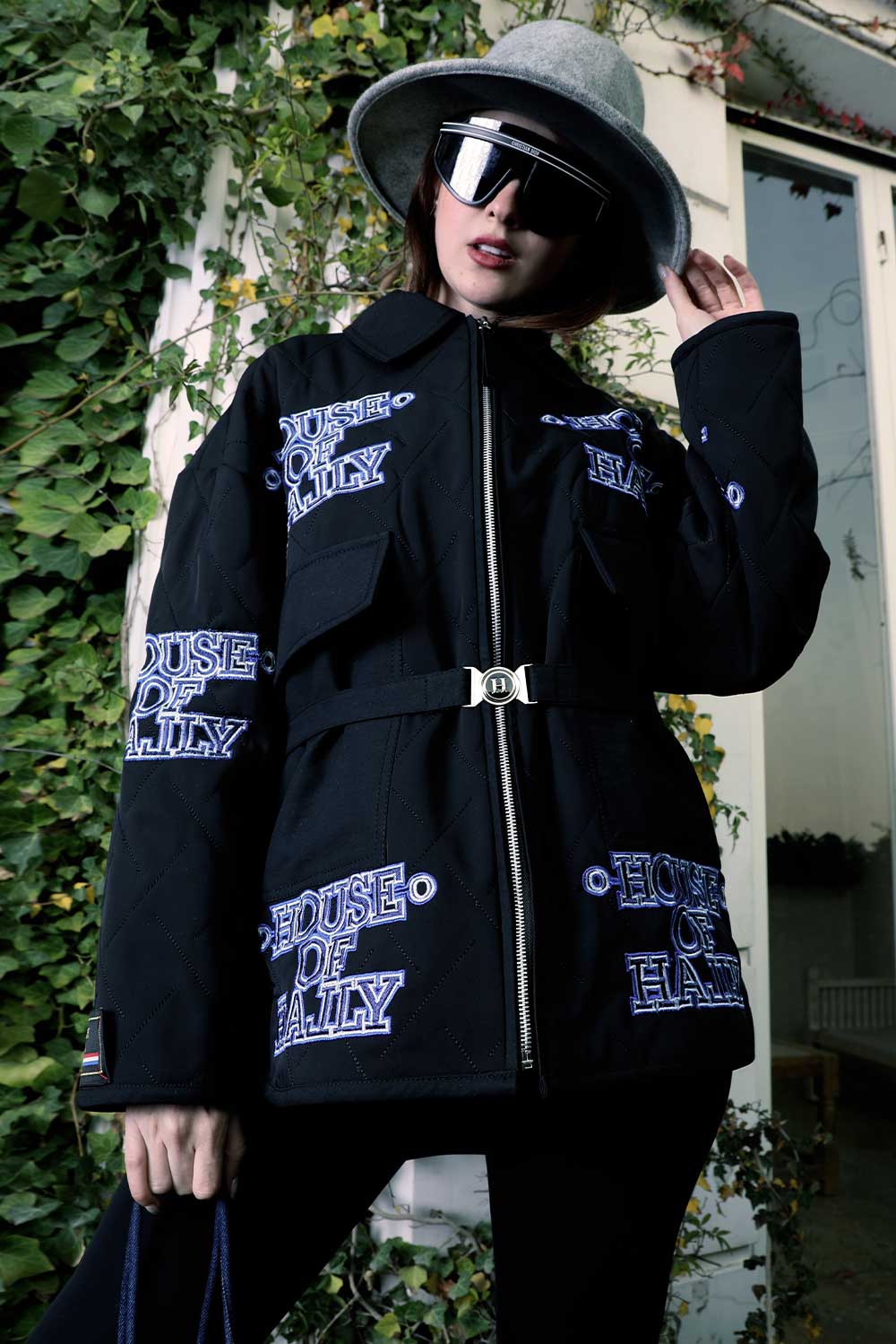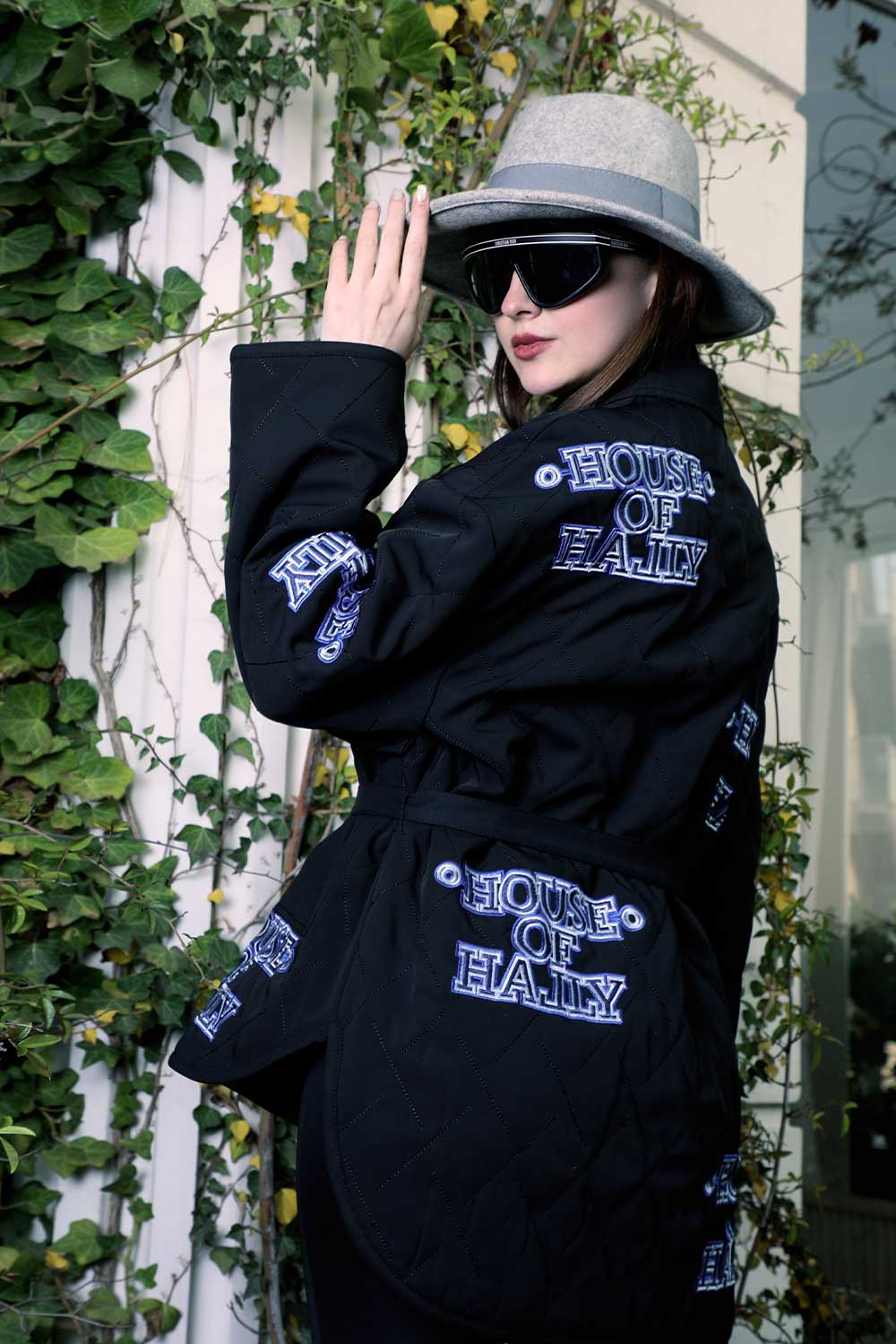 black raincoat featuring a cozy puffer interior and our House of Hally embroidered waist belt