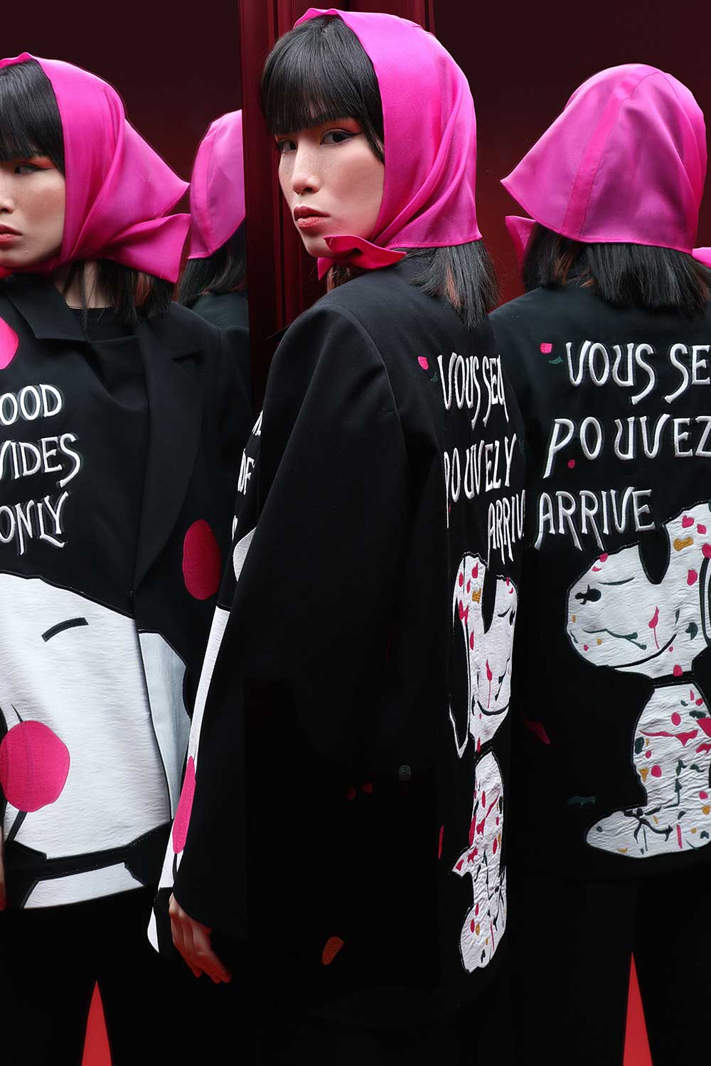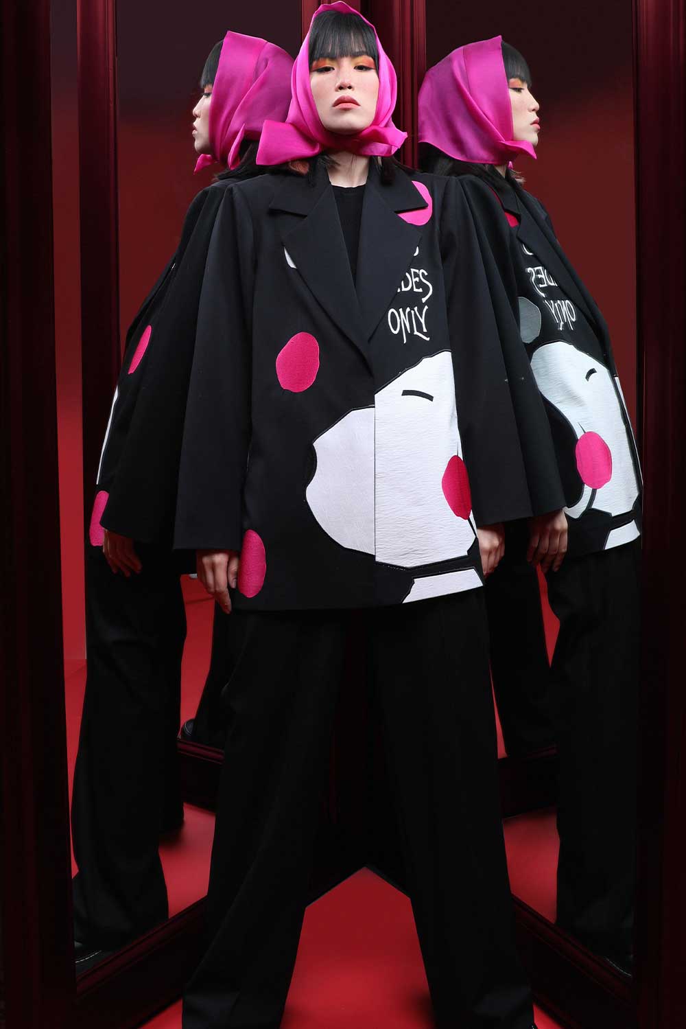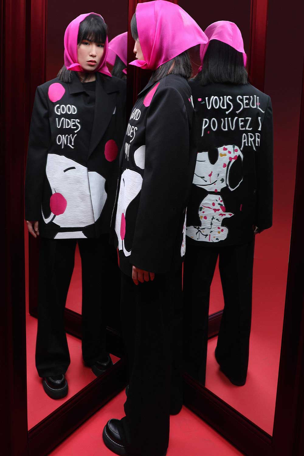 Black single breasted jacket with large pink and white polka dot embossed Snoopy and Good Vibes stitching