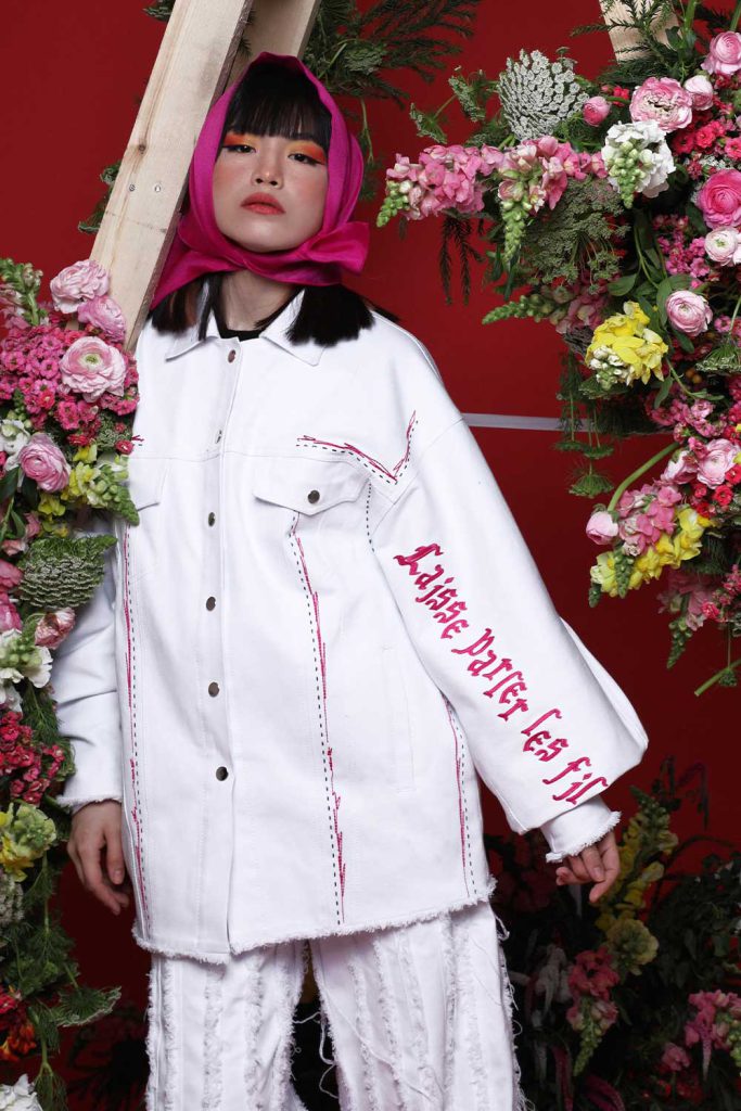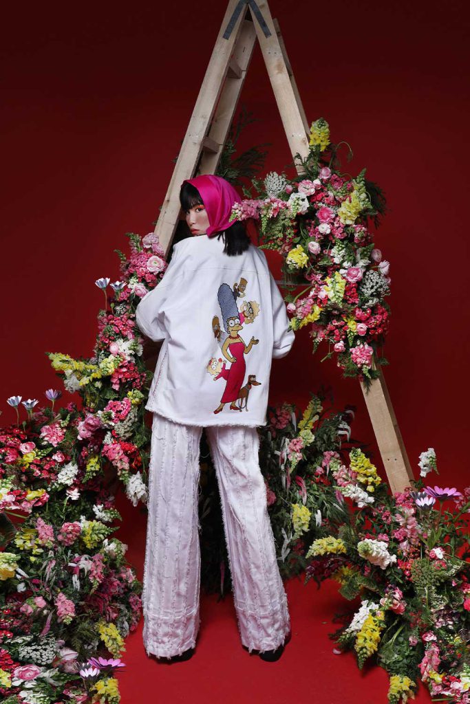 White over sized denim jacket with pink stitching and black press button front-large Mrs Simpson and family embroidered on back