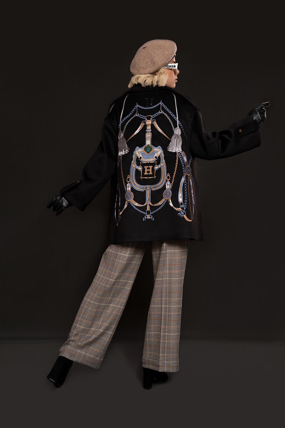 Midi black cashmere coat with large jumping horse embellished with stones on front