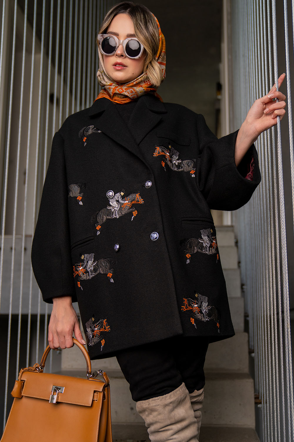 Home2022January Black wool short jacket with embroidered jumping horses in grey/orange on front and back