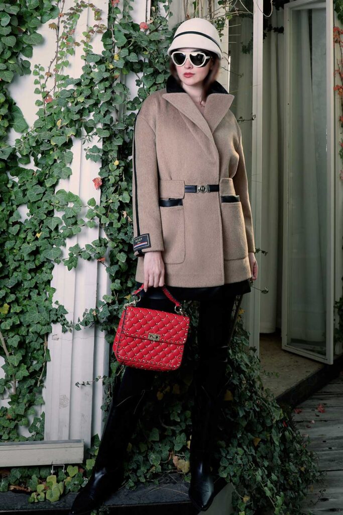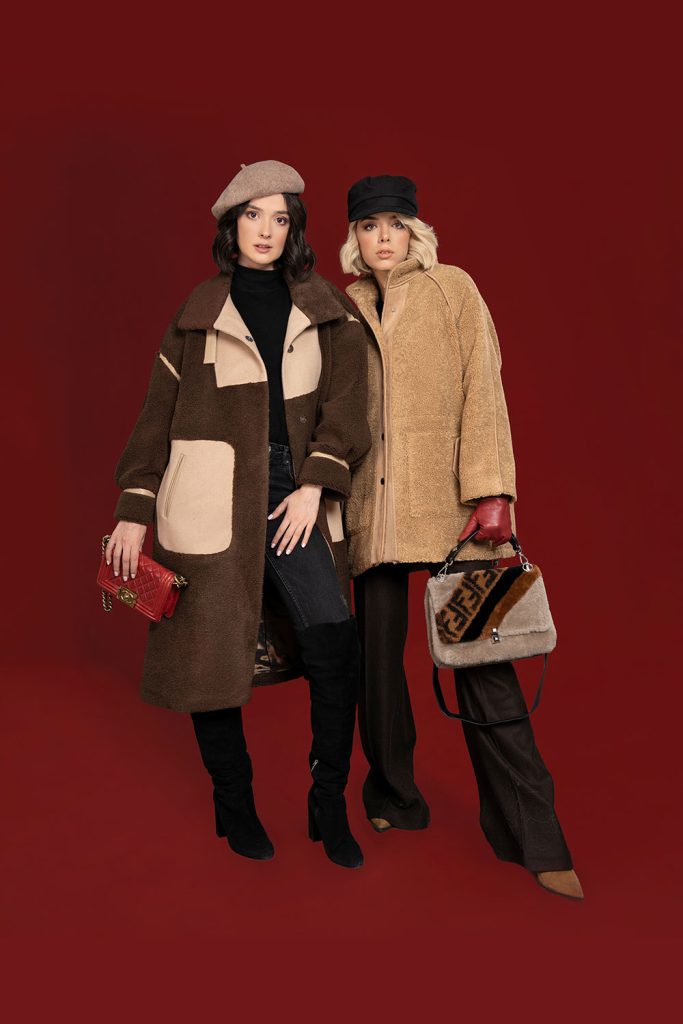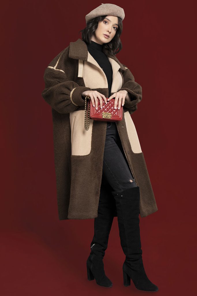 Brown oversized sheepskin coat with closed cuffs. Creme detail on collar and pockets