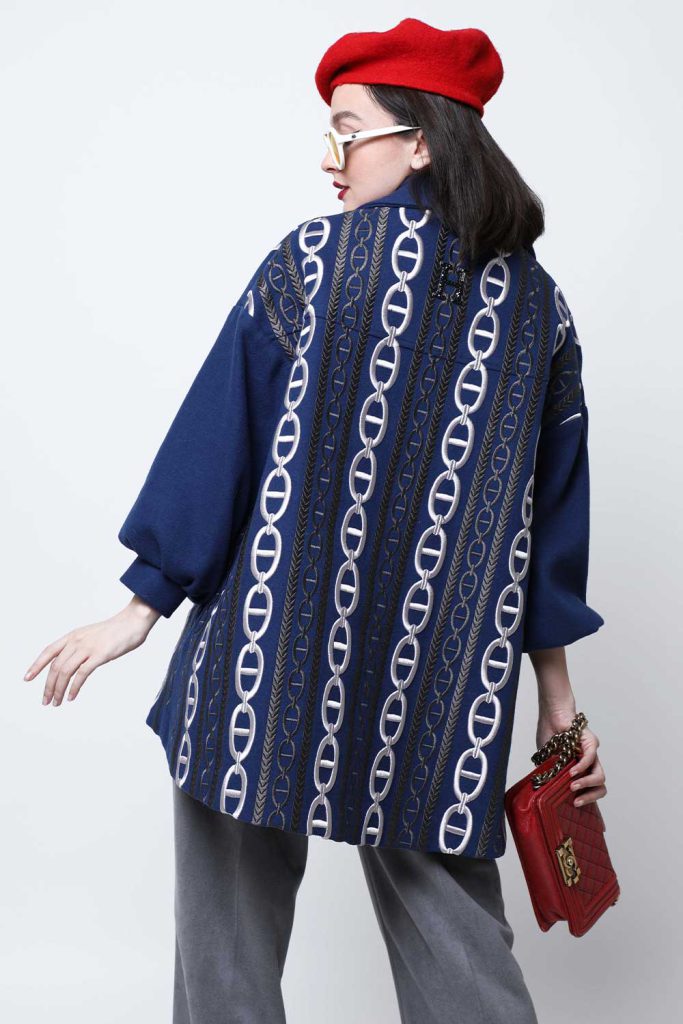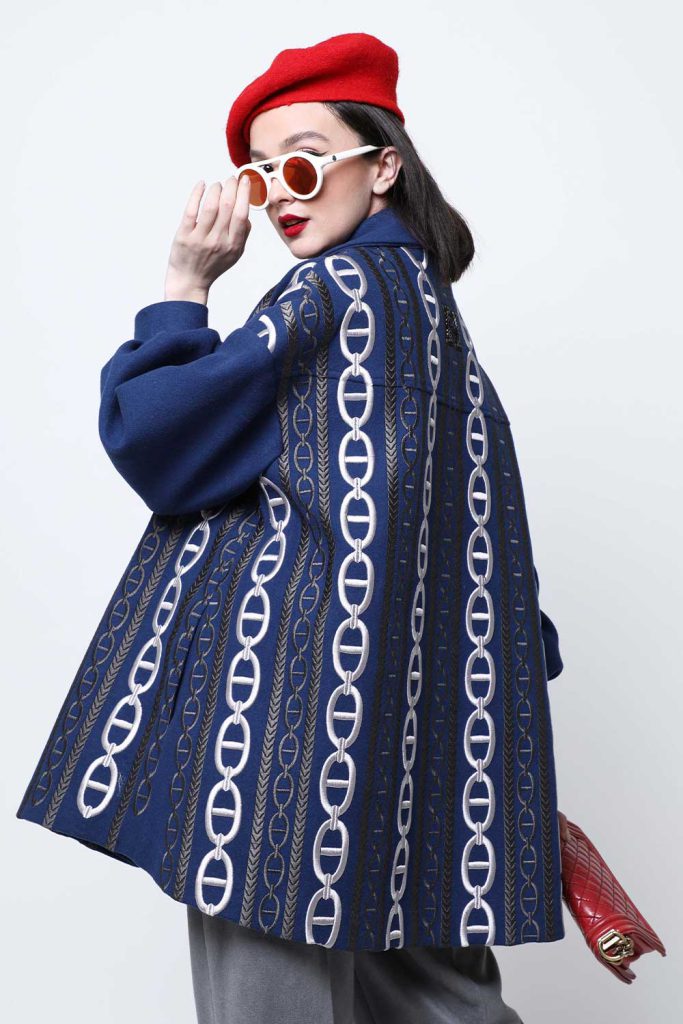 Blue mid length swing coat with exceptional diagonal satin embroidery of chains all over in white and charcoa