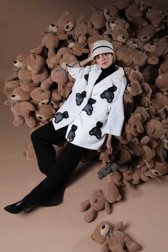 Single breasted white wool midi jacket with grey patterned teddies embellished all over