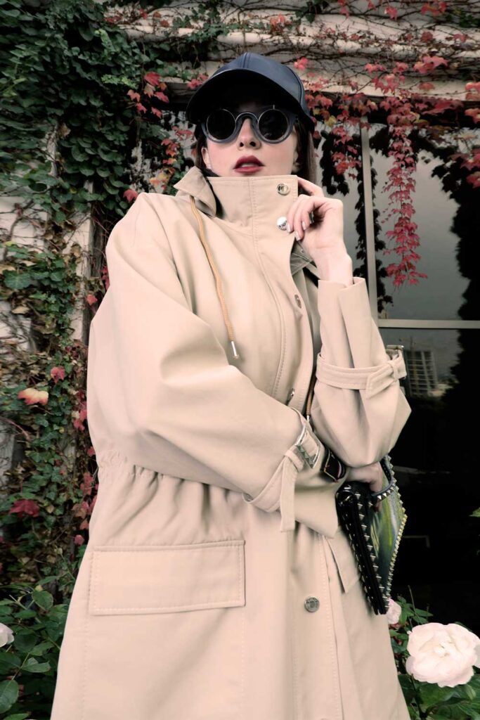 black raincoat featuring a cozy puffer interior and our House of Hally embroidered waist belt