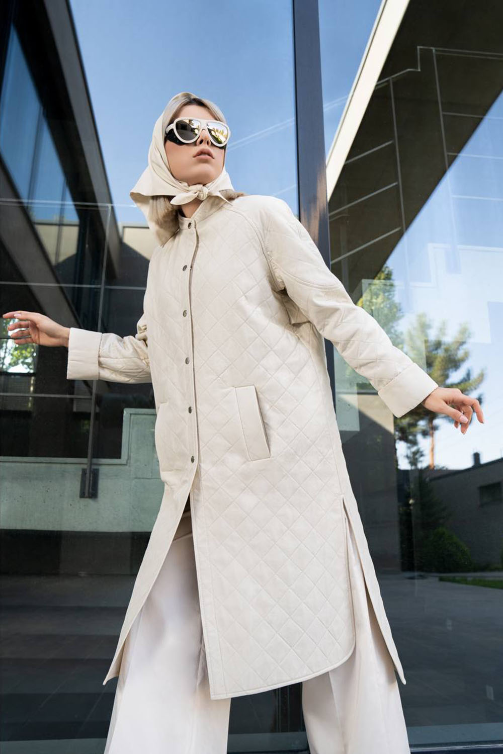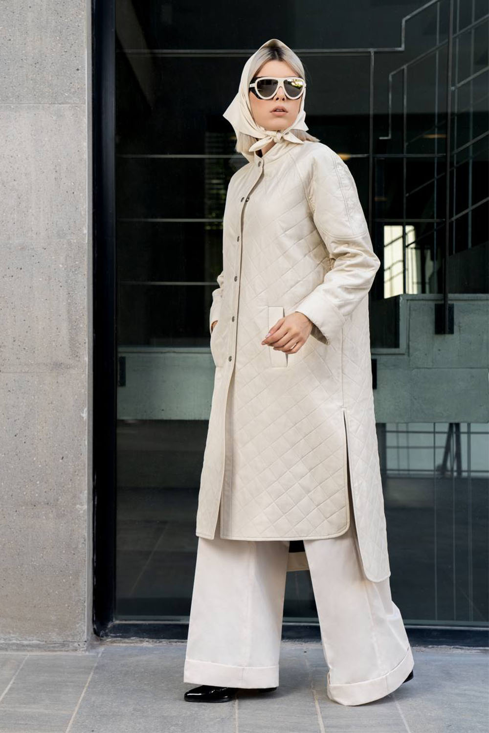 Home2022Jeannette Collection Creme stitched rain jacket knee length with side slit and press buttons
