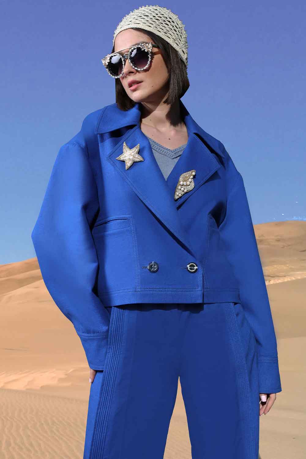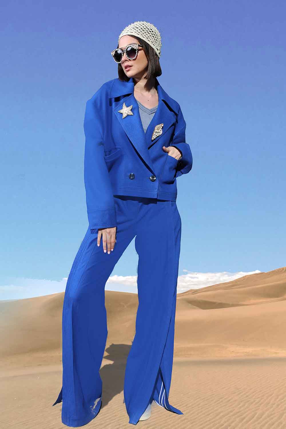 Home2023Evocative Collection Deep blue linen trouser suit with crop double breasted jacket and sliced trousers