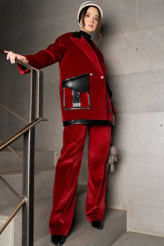 Dark red velvet suit- black leather trim and pockets