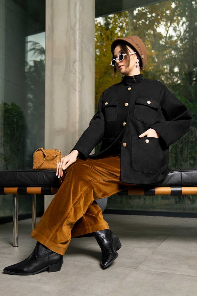 Black cashmere jacket and real fur black and yellow detail on collar