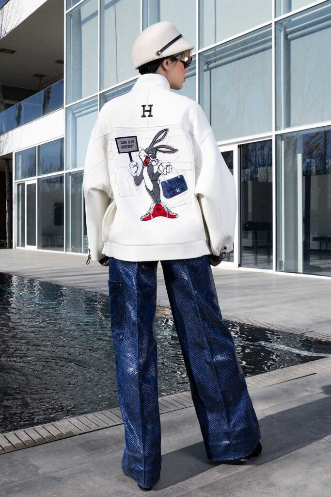 White cashmere jacket with bunny embossed on back and drawstring sleeves