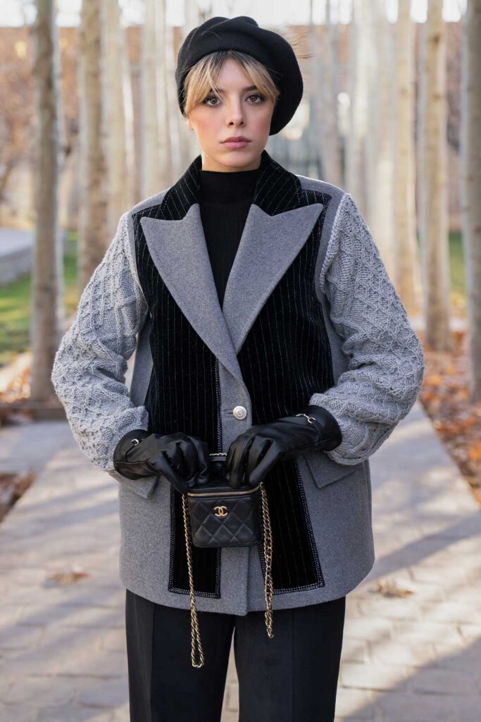 Grey cashmere jacket with hand knitted sleeves and black velvet detail on front