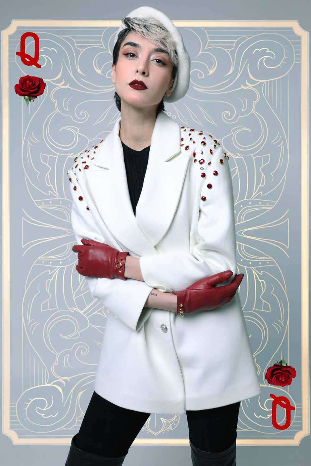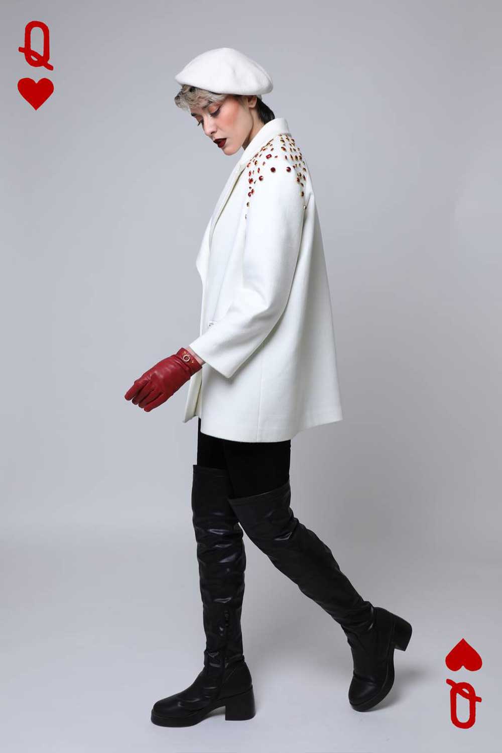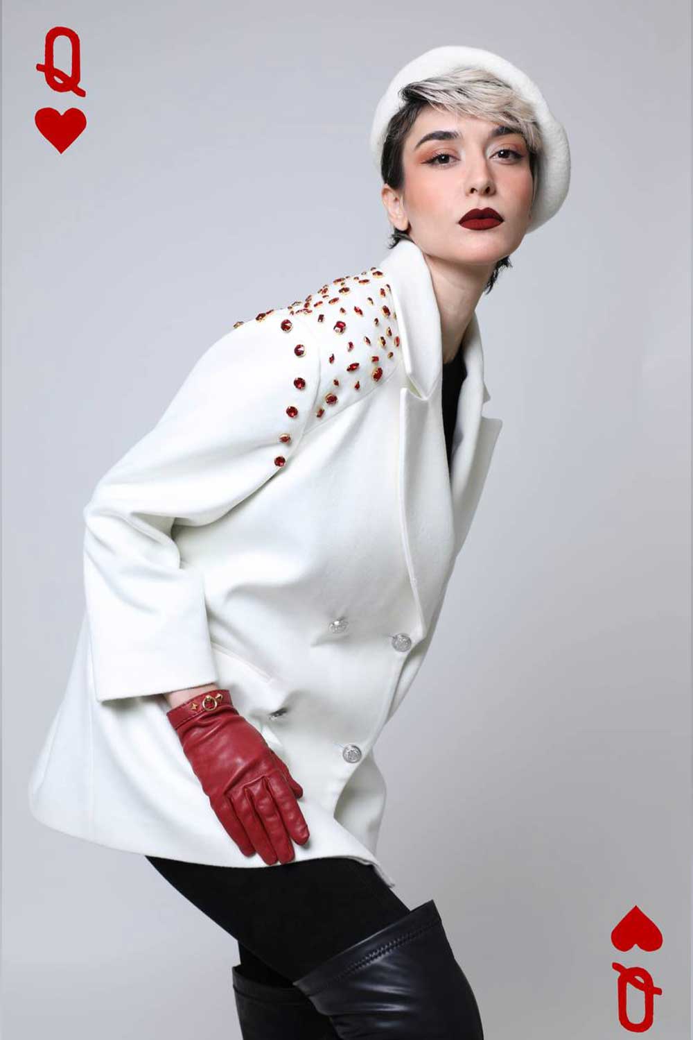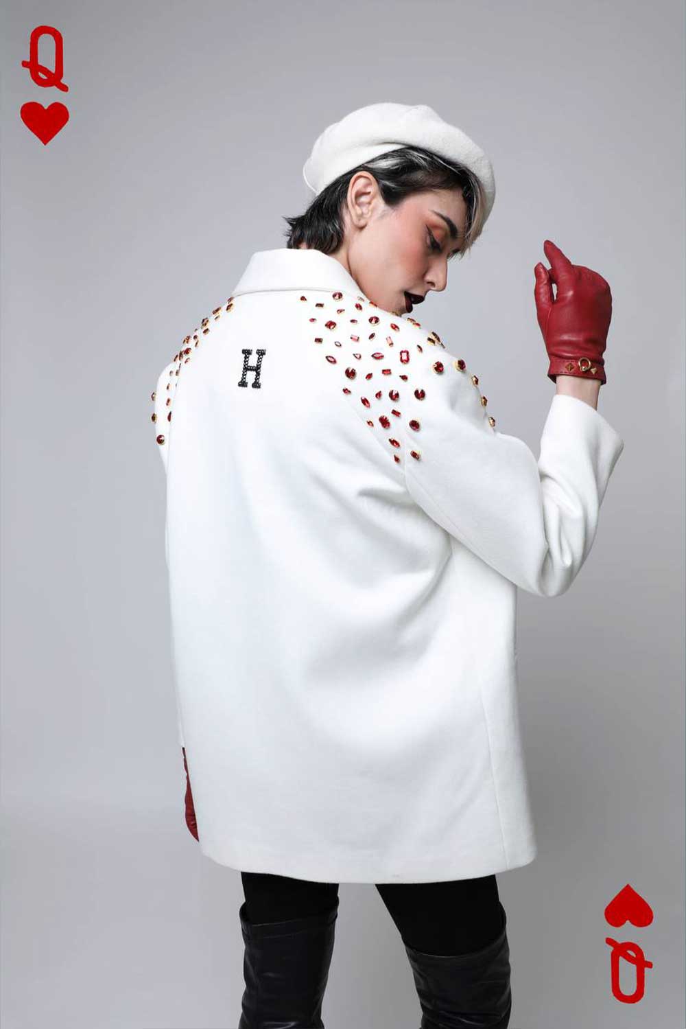 Home2023valentine2023 Double breasted white loose jacket with red stones embellished on shoulders
