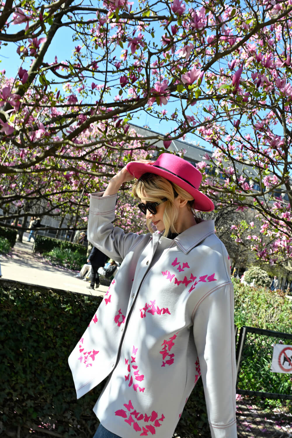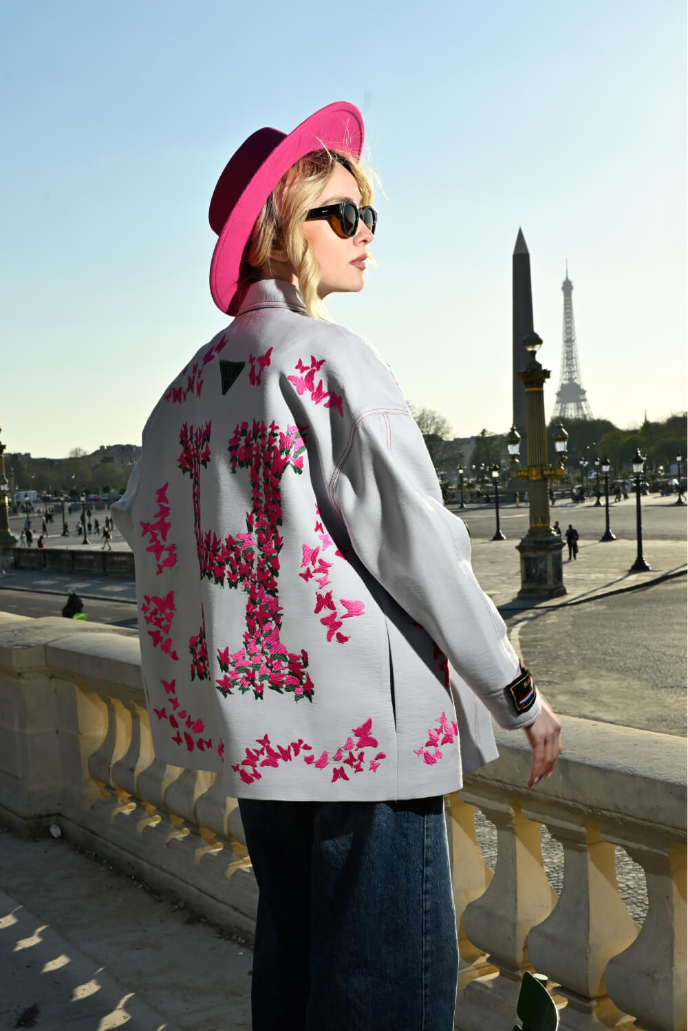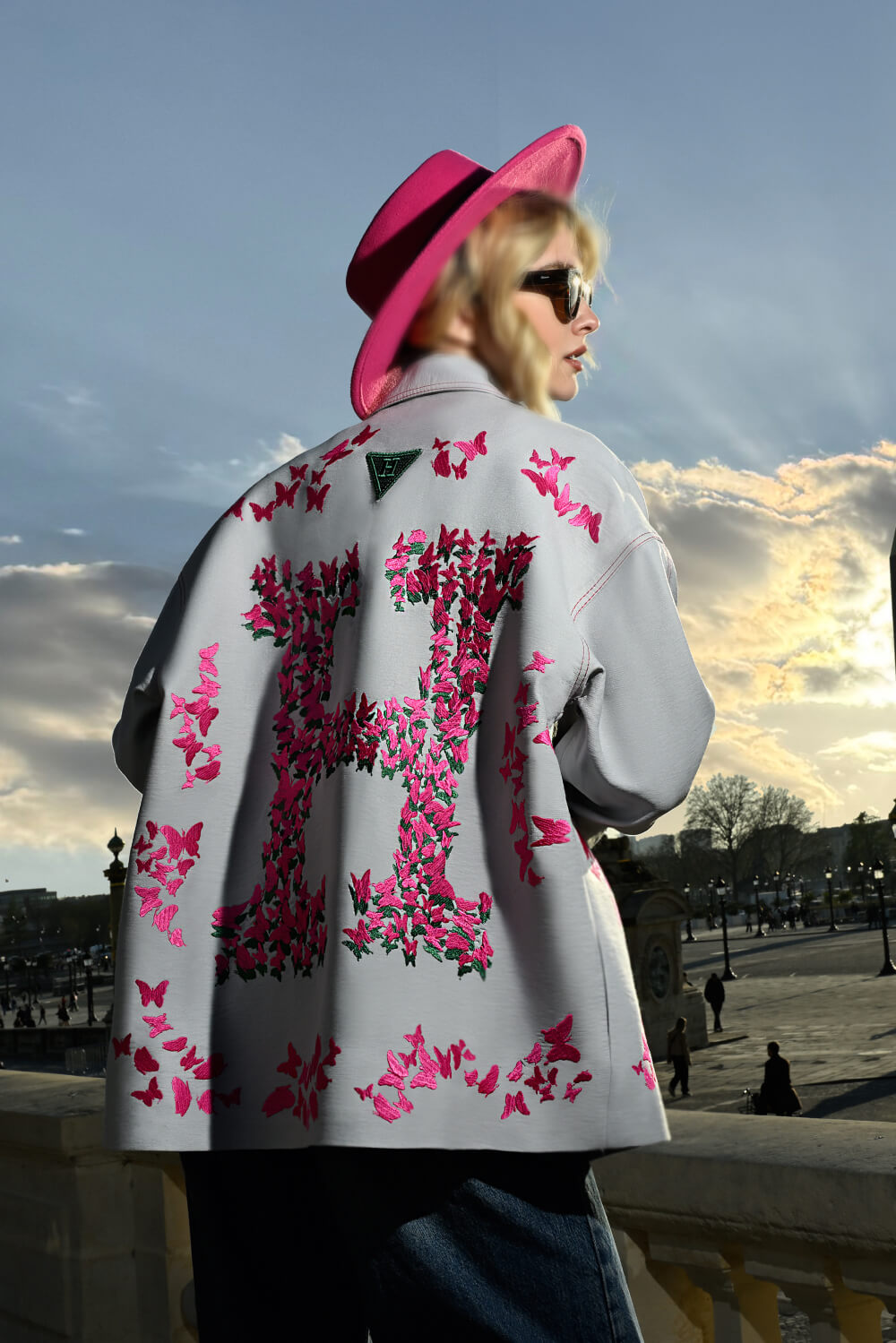 Be the first to review “Dove grey wool-blend overcoat adorned with fuchsia butterfly motifs in graduated density” Cancel reply