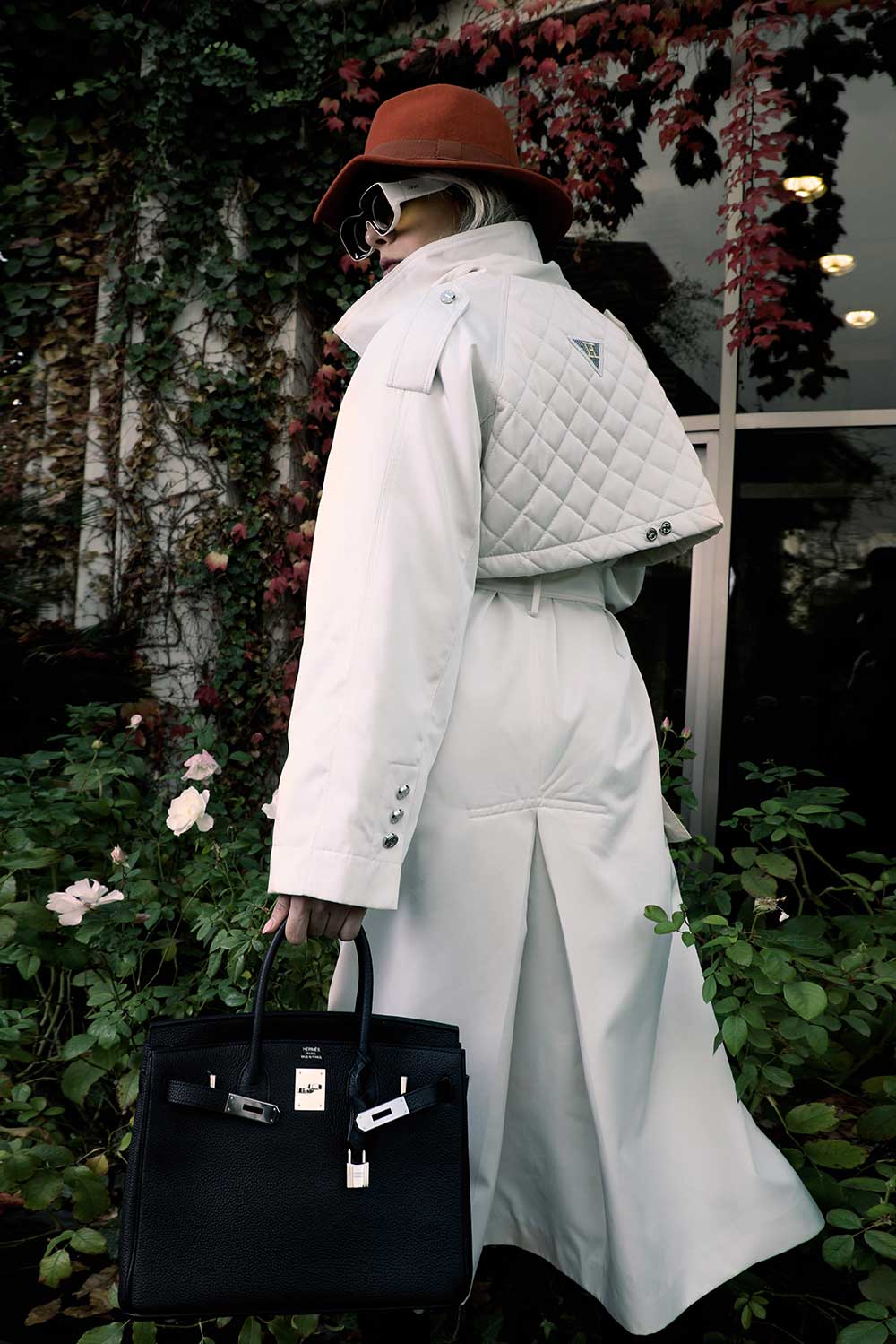 black raincoat featuring a cozy puffer interior and our House of Hally embroidered waist belt