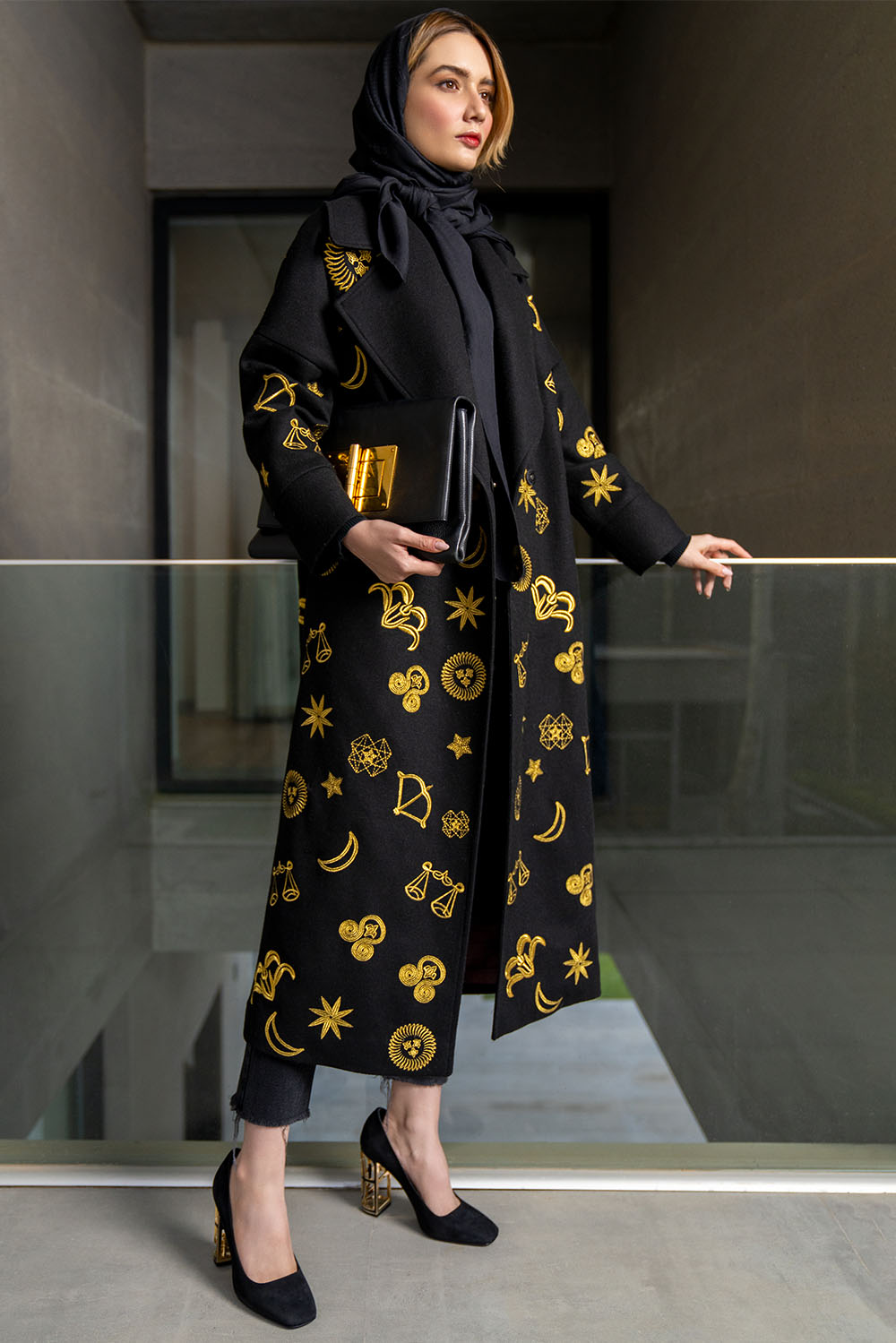Full length black woollen ladies coat covered with multiple symbols embroidered all over in gold