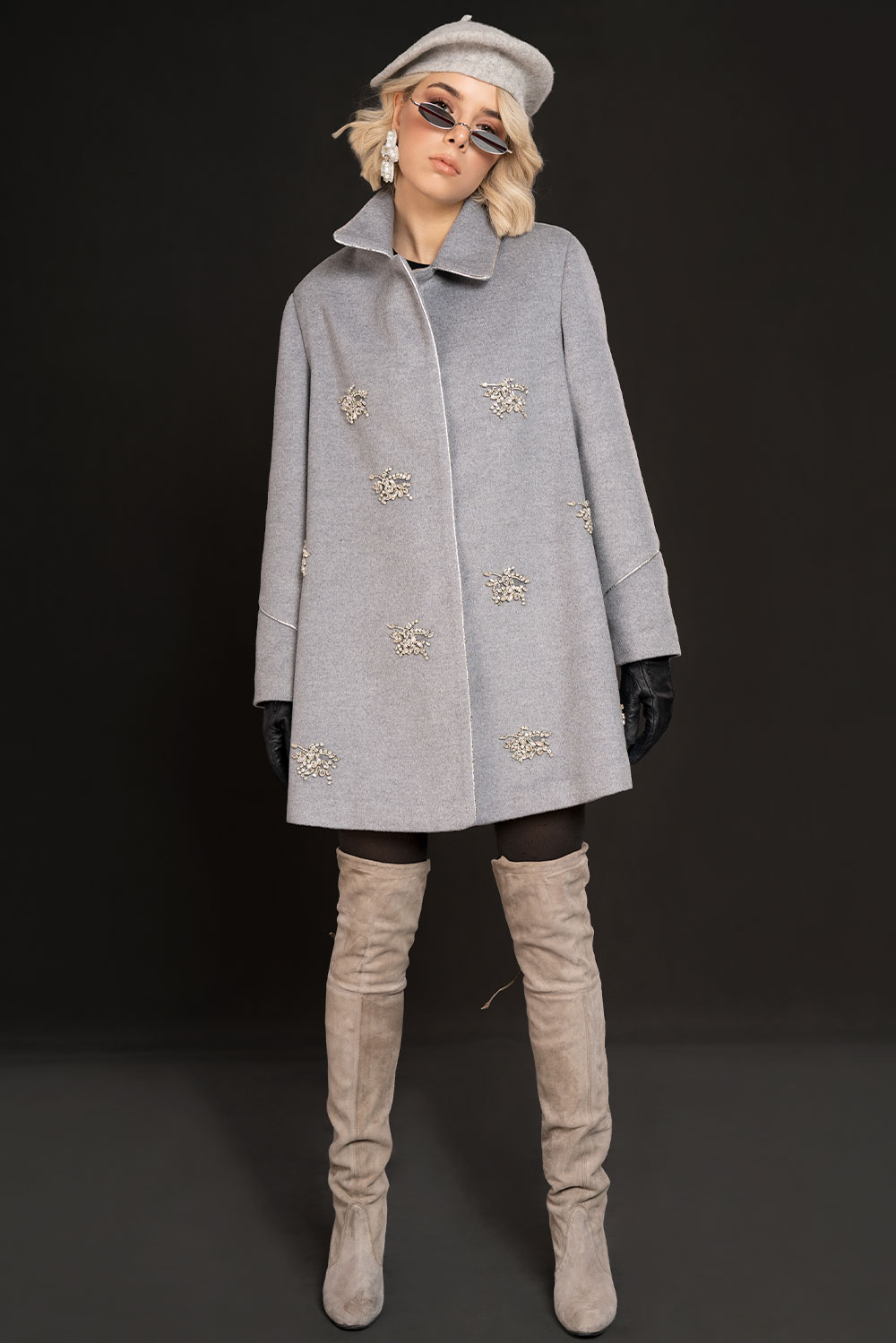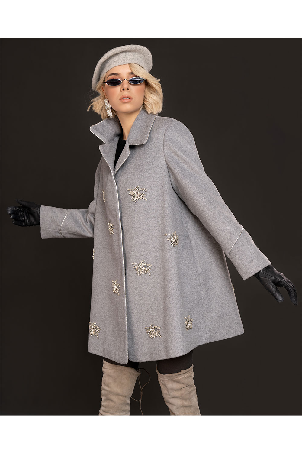 Home2023January Grey mid length cashmere coat with satin grey piping and stone embellished’Flying Knights’ embellished on front
