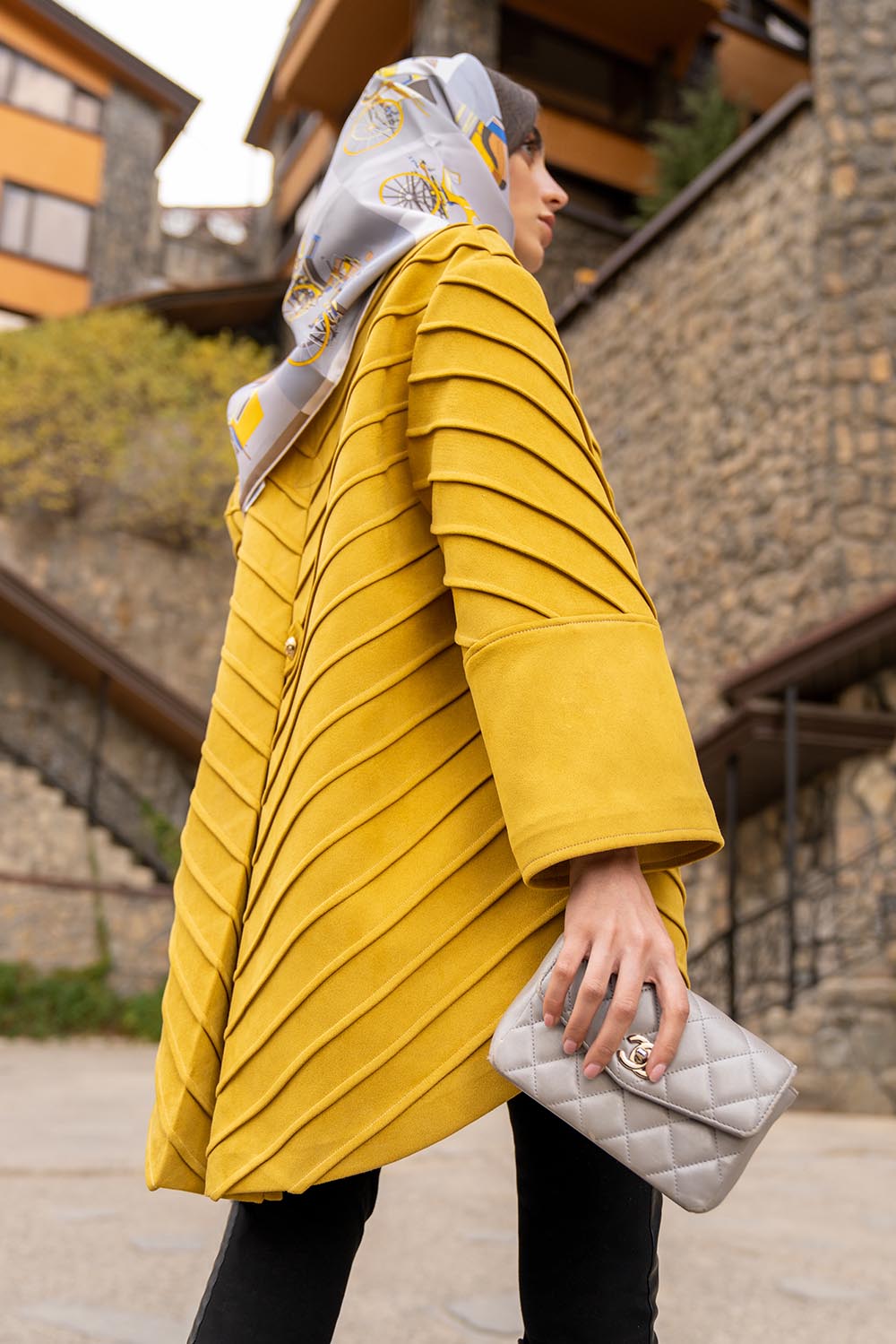 Home2021November Horizontal pleated yellow coat- above knee with button on back