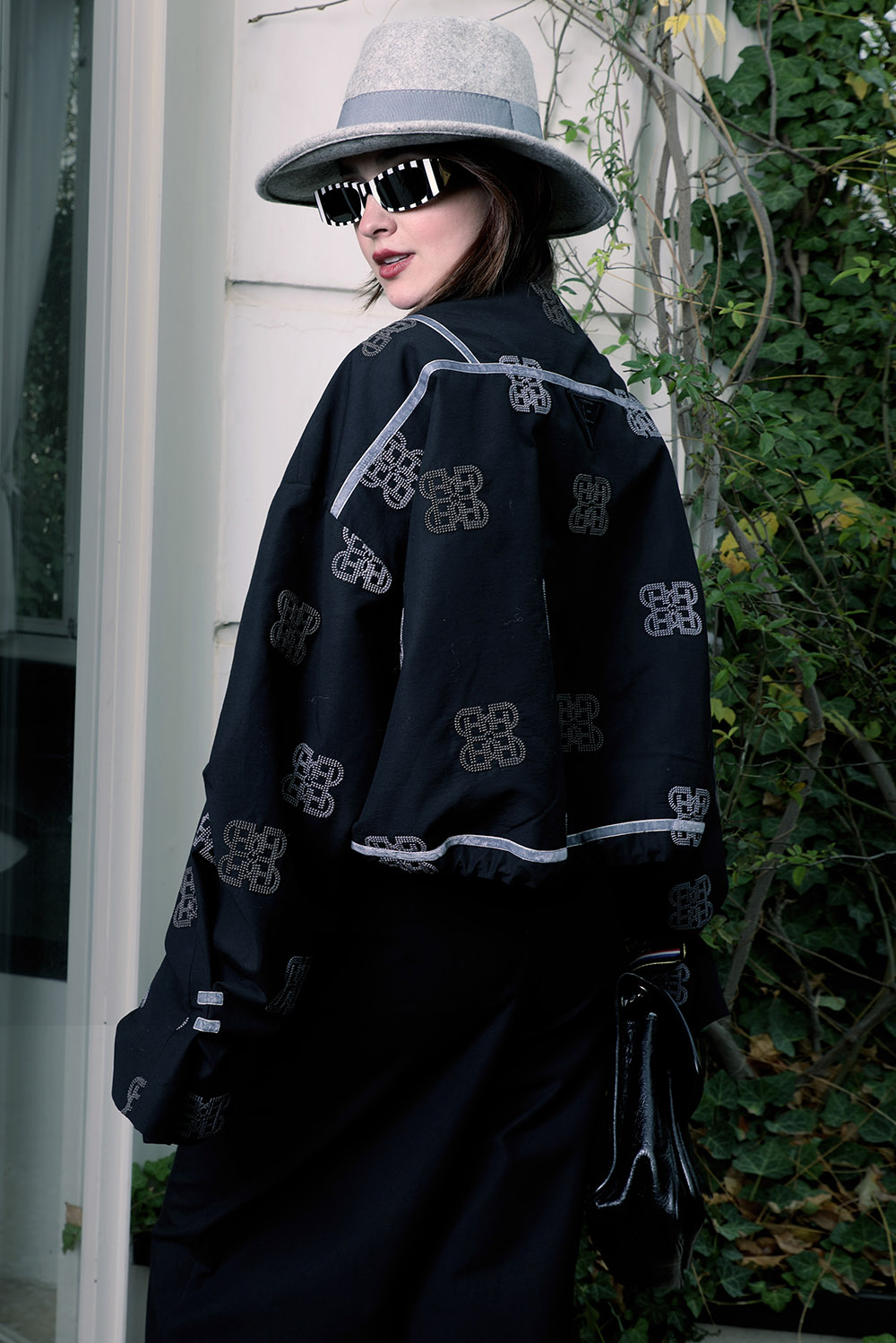 black raincoat featuring a cozy puffer interior and our House of Hally embroidered waist belt