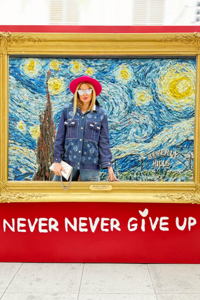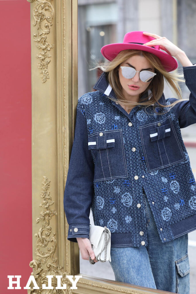 Oversized denim with geometric embroidery, HALLY logo accents, and standout style