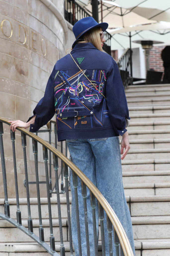 Jean suit featuring hand-embroidered golden constellation and equestrian motifs