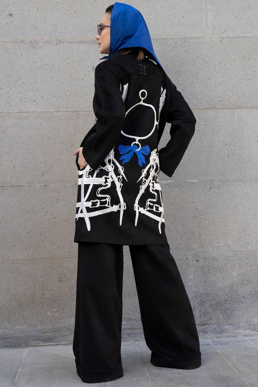 Black mid length jacket with horse head silhouette frame embroidered on back in blue and silver
