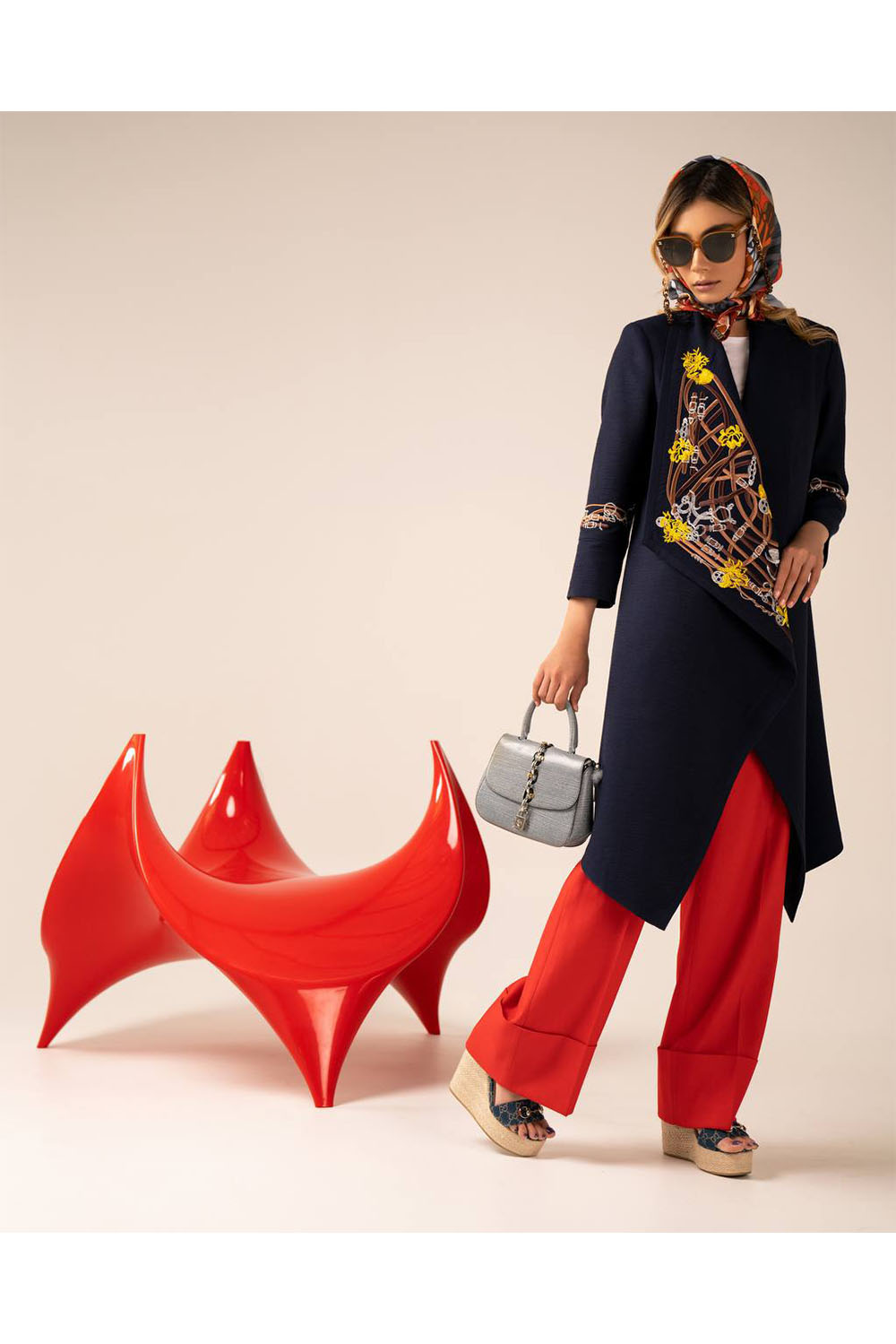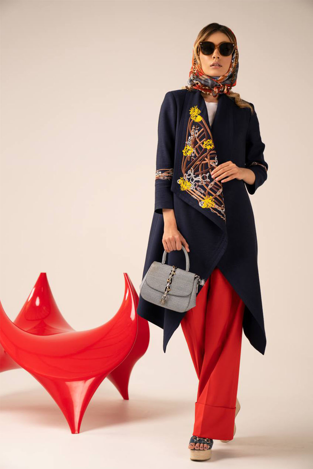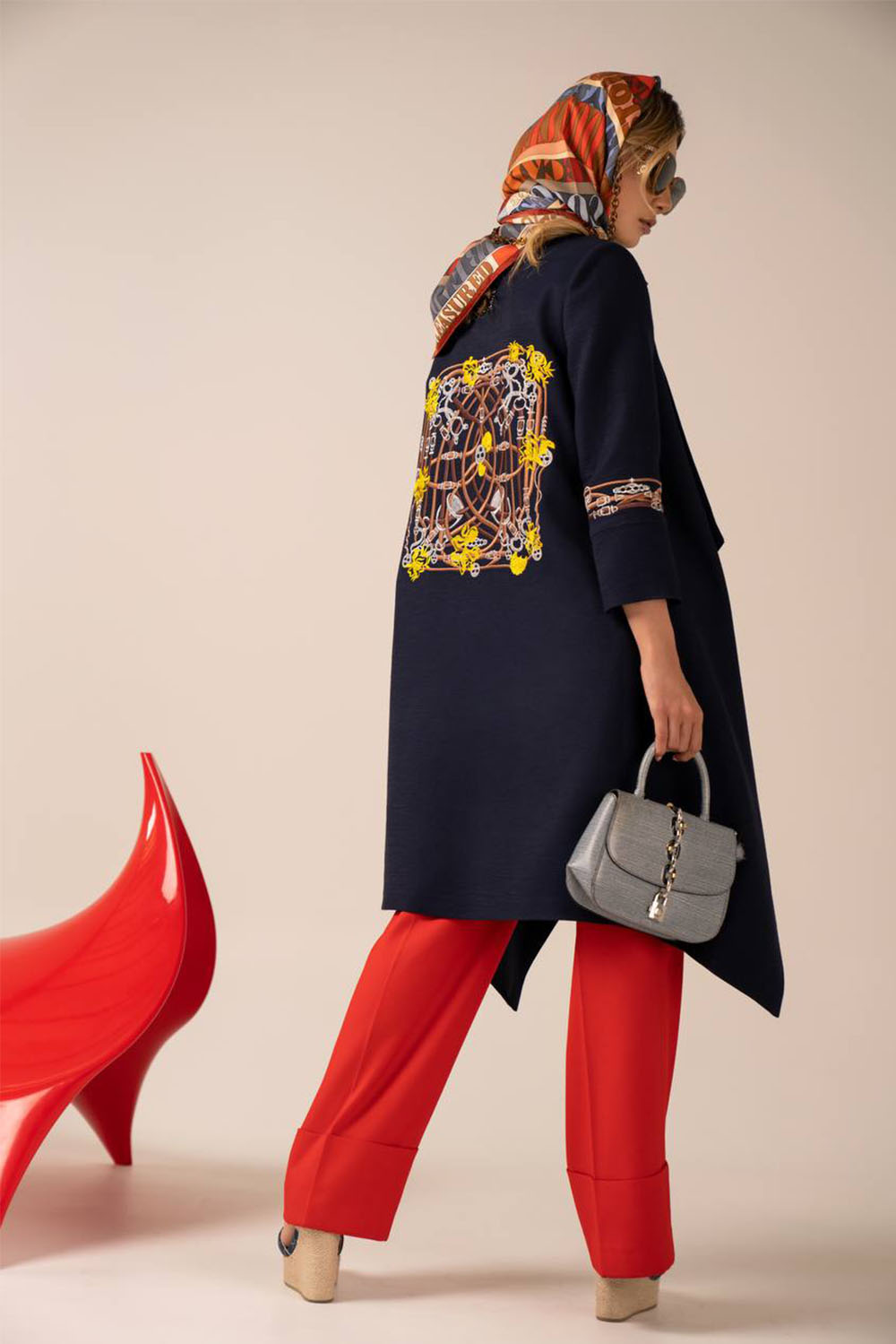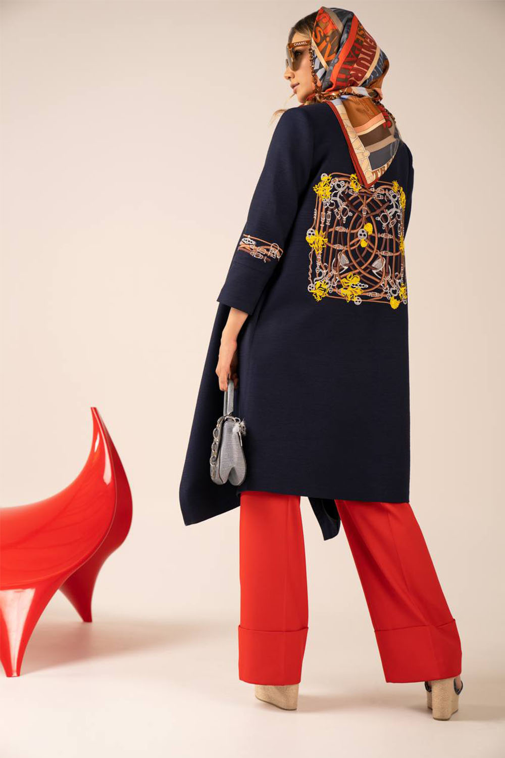 Home2022spring Knee length coat in black with saddles and chains embroidery on back and cuffs in gold, silver and brown.