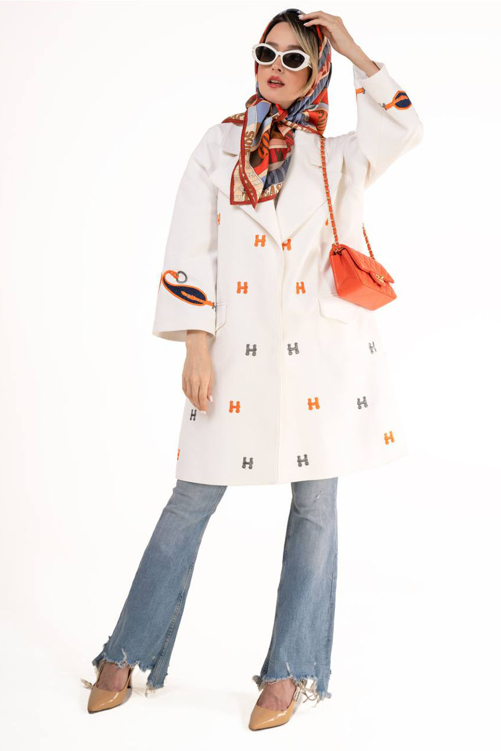 Home2022June Knee length white coat with chains and straddle embroidery in light blue/orange and grey on back and around cuffs
