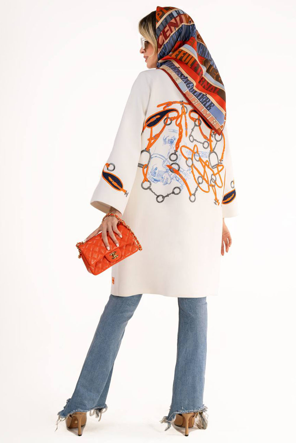 Be the first to review “Knee length white coat with chains and straddle embroidery in light blue/orange and grey on back and around cuffs” Cancel reply