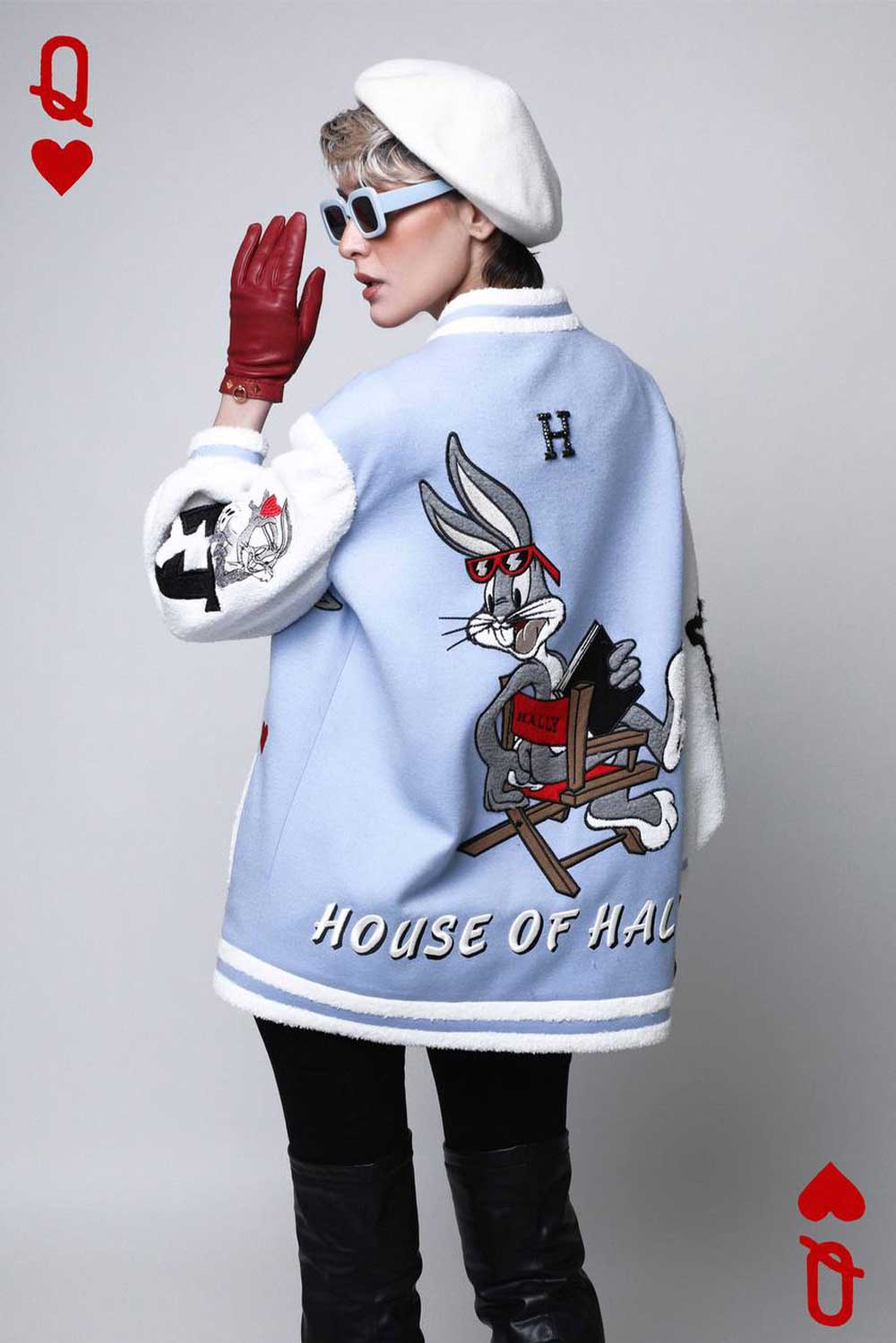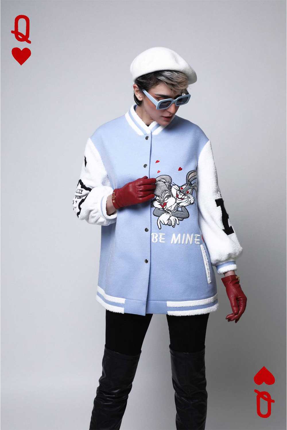 Light blue varsity jacket with white sleeves. ‘In Love BugsBunny’ embellished on front and back