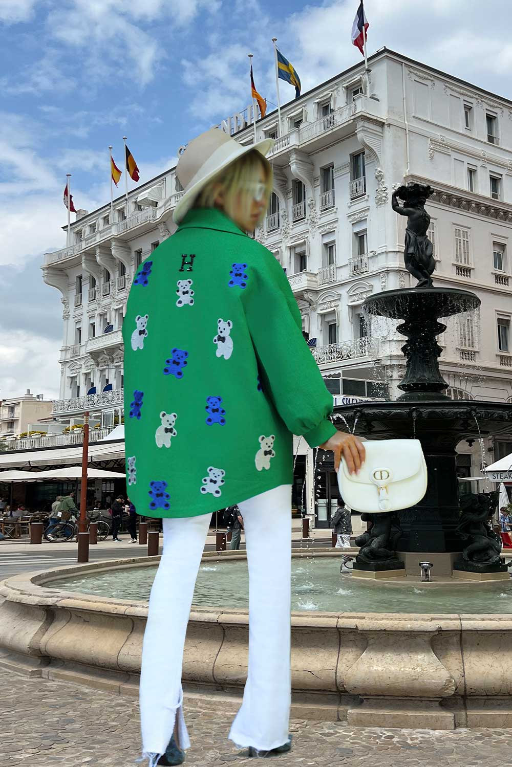 Home2023La Mer Cannes Light green jacket with closed pleated cuffs with light and dark blue teddies all over.