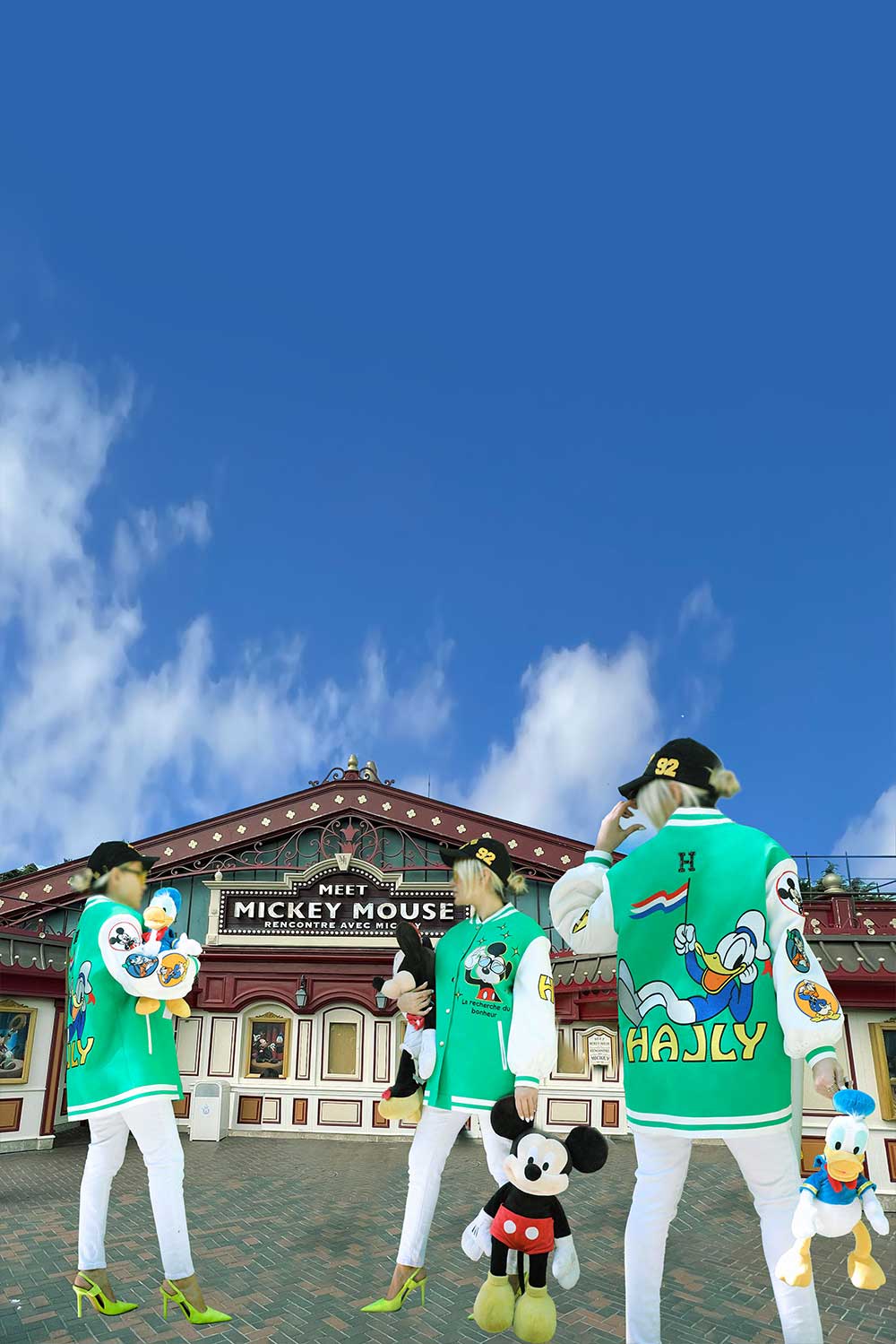 Light green varsity jacket with white sleeves – Donald Duck with French flag on back and Micky on front