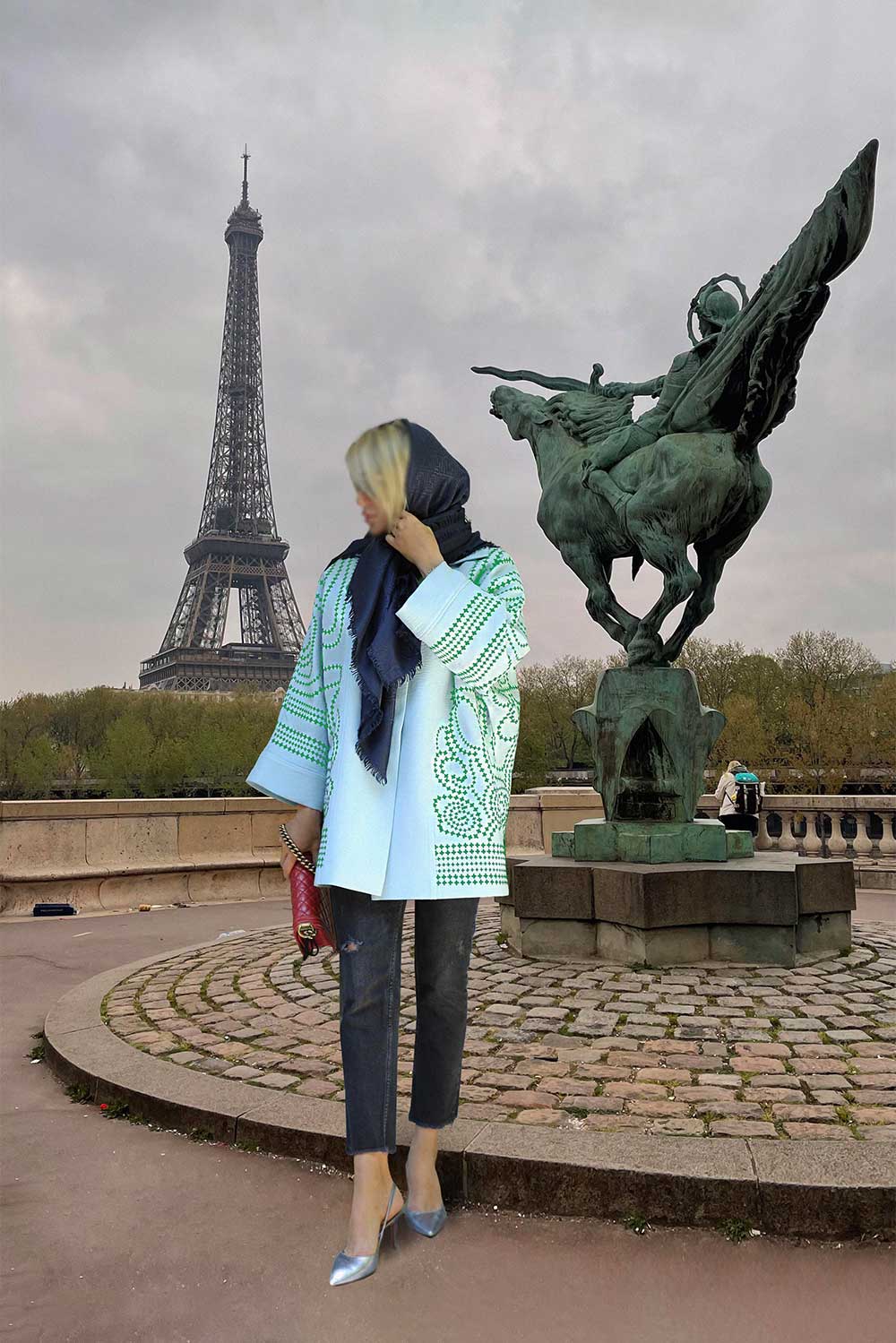 Mid length light blue press button jacket with denim detail on pockets, sleeves and cuffs.