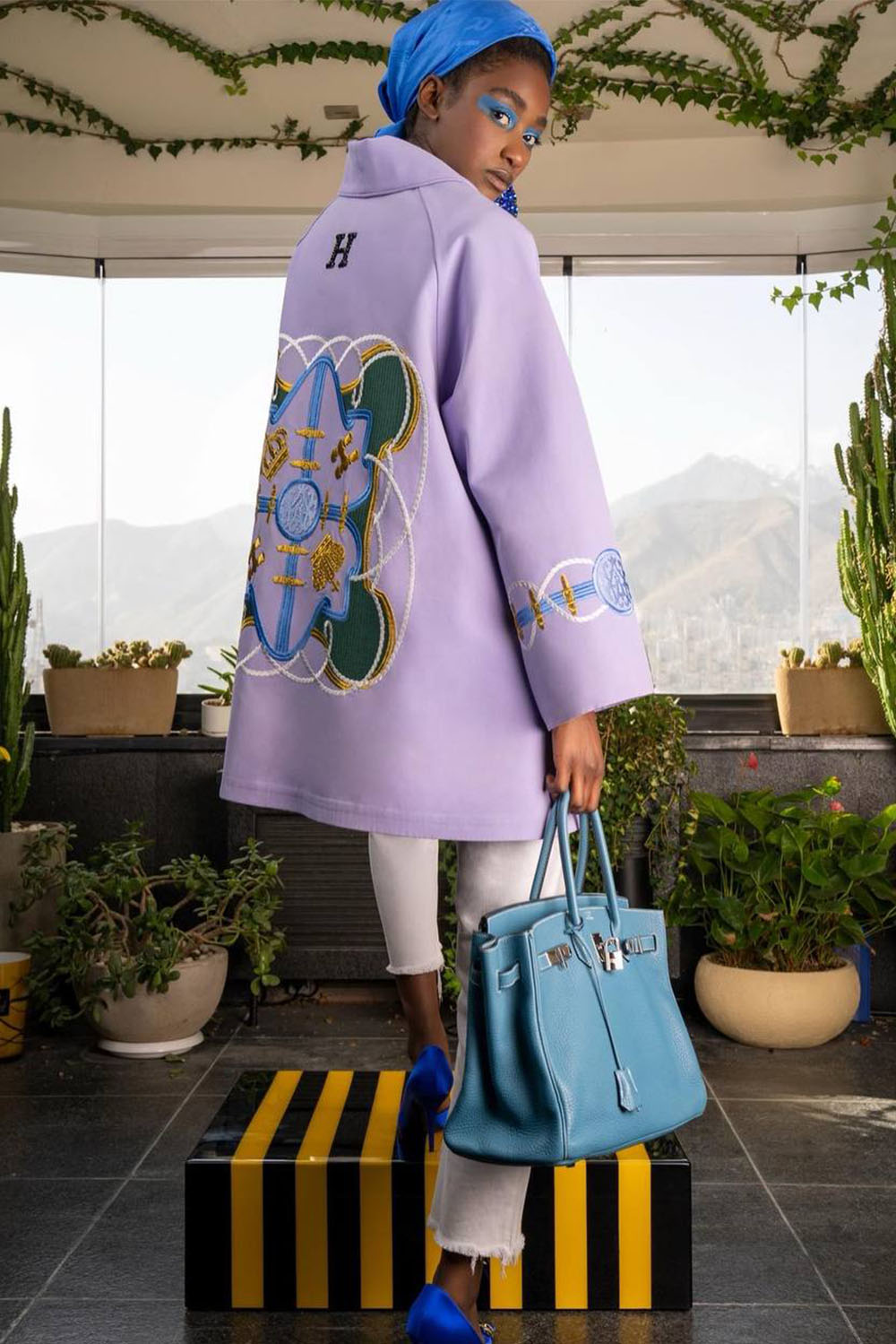 Mid length jacket in bright sky blue with eye embroidery in gold and navy