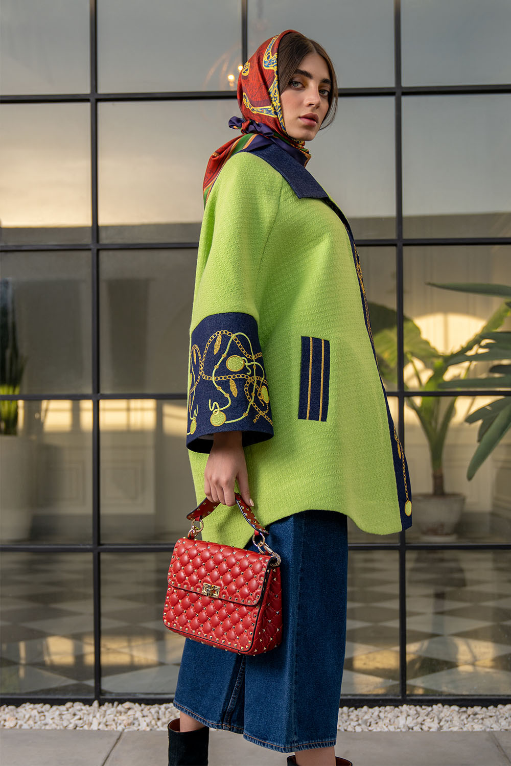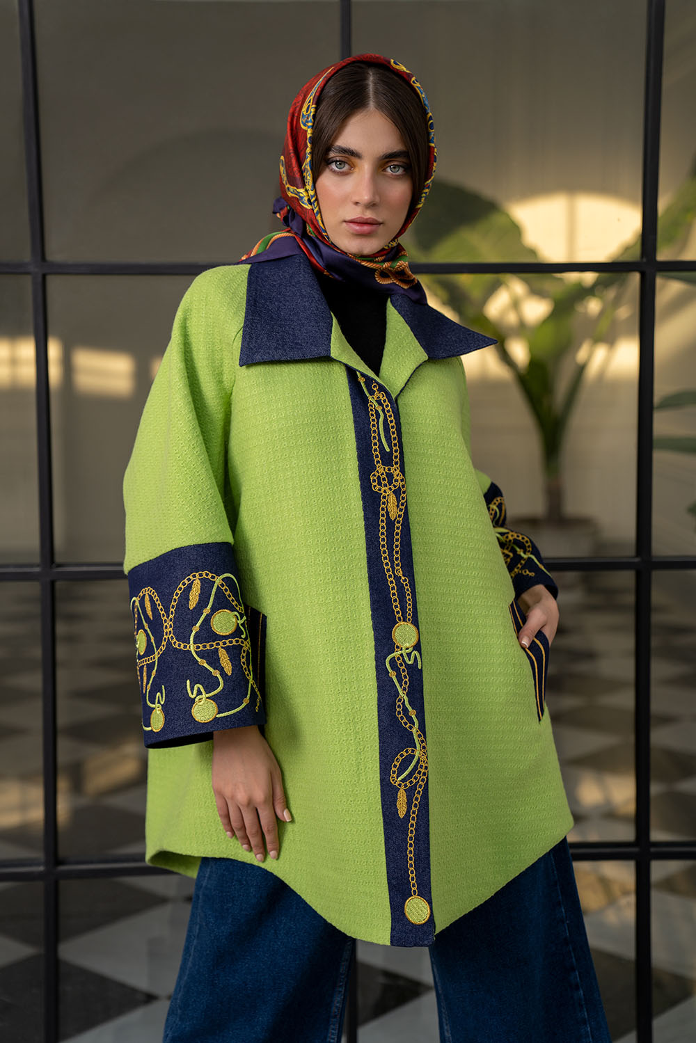 Lime green coat with navy sleeves with classic embroidery