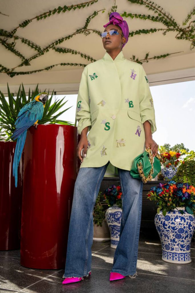 Pastel green light mid jacket side arm pleats with alphabet embroidery all over in lilac, green, gold and silver