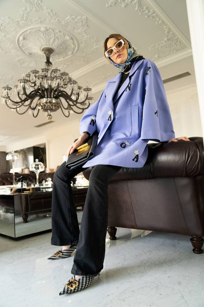 Light blue swing jacket single breasted with alphabet embroidery in black – small silver crowns on letters all over