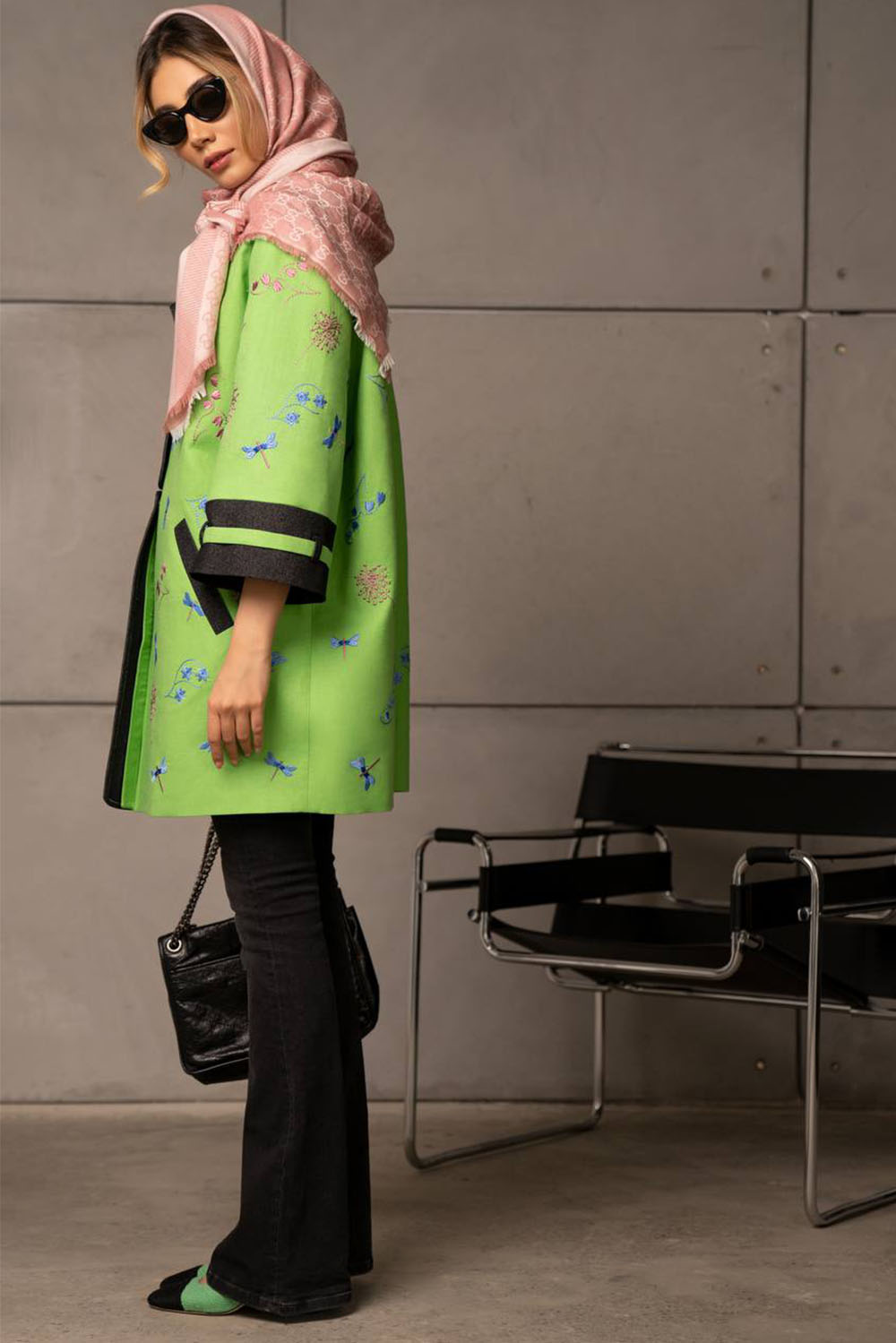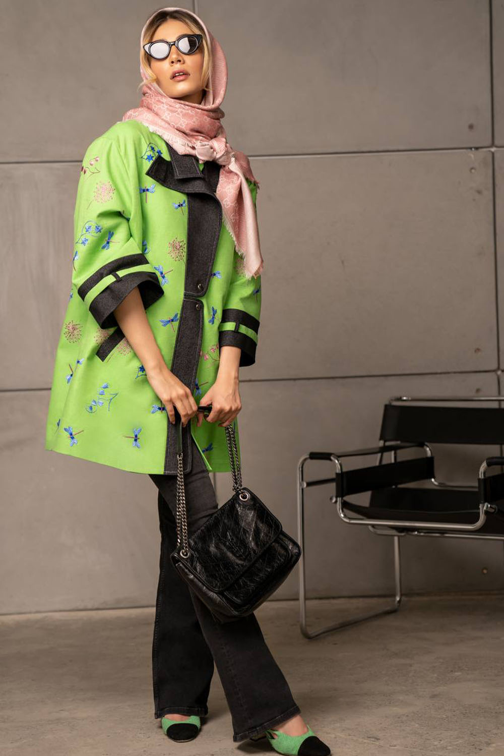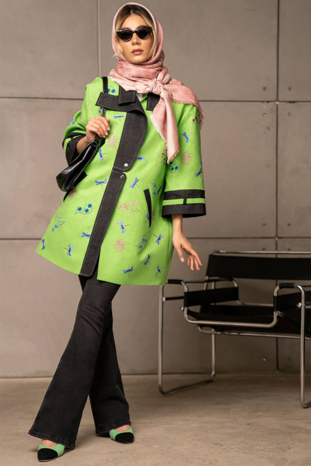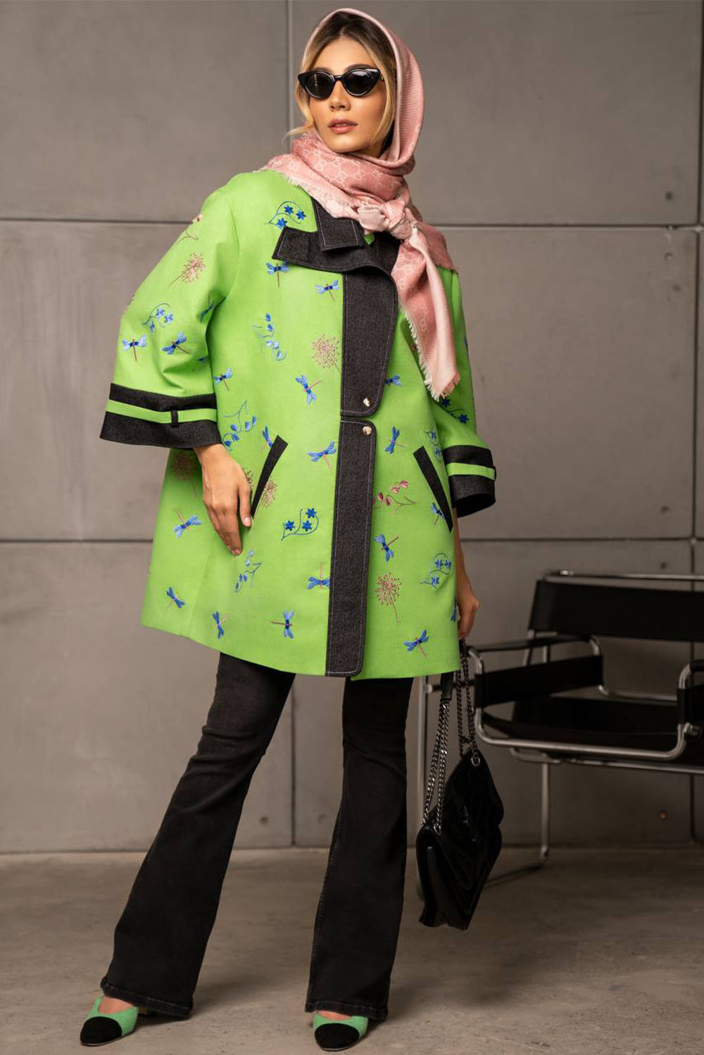 Lime mid length jacket with blue embroidered dragonflies and flowers – denim on cuffs, pockets and front