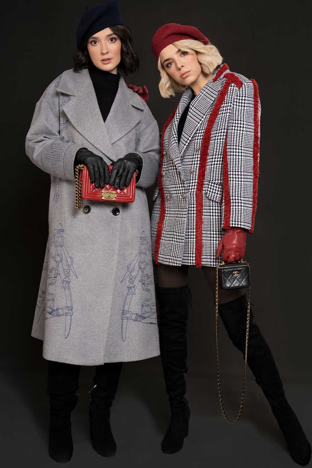 Home2023January Long light grey cashmere coat with sketched blue embroidery of tassels/ belts and chains