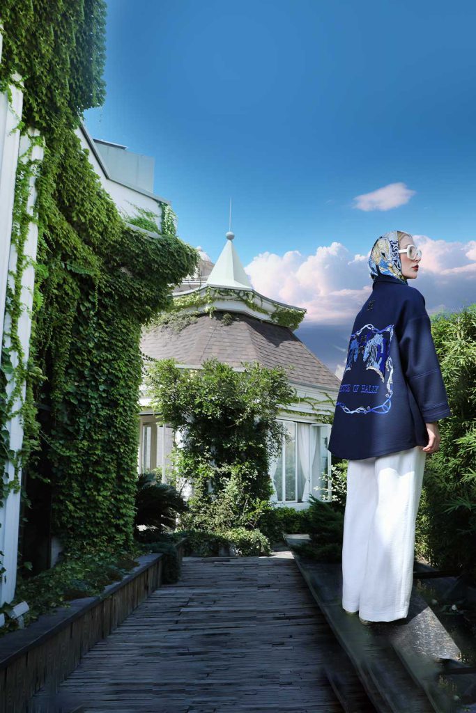Navy blue jacket with House of Hally and graffiti horse’s embroidered on back in shades of blue